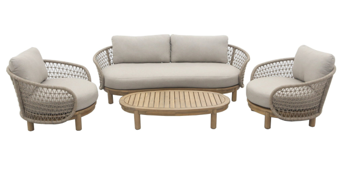 Das Maka-Lounge-Set kombiniert organische Formen mit luxuriösen Materialien zu stilvollen und einladenden Outdoor-Möbeln. Bestehend aus einem geräumigen 3-Personen-Loungesofa, zwei großzügigen Loungesesseln und einem praktischen ovalen Loungetisch, ist dieses Set die perfekte Wahl für einen komfortablen und stilvollen Außenbereich. Das Gestell des Loungesets ist mit einer warmen Teakholzoptik versehen, die perfekt mit dem Rope in einem eleganten Kreuzmuster harmoniert. Diese Kombination verleiht der Lounge-Garnitur einen Designer-Look, ohne ihren natürlichen Charakter zu beeinträchtigen. Die runden Formen der Sitzgelegenheiten verleihen der Garnitur einen verspielten, organischen Touch.