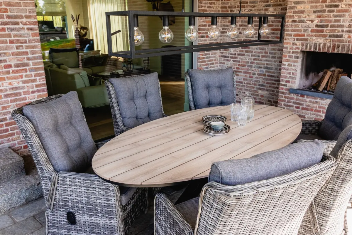 Palu Teakholz oval Gartentisch 240x120cm mit 6 Dublin Gartenstühlen (Ash Grey)