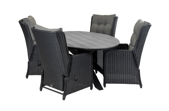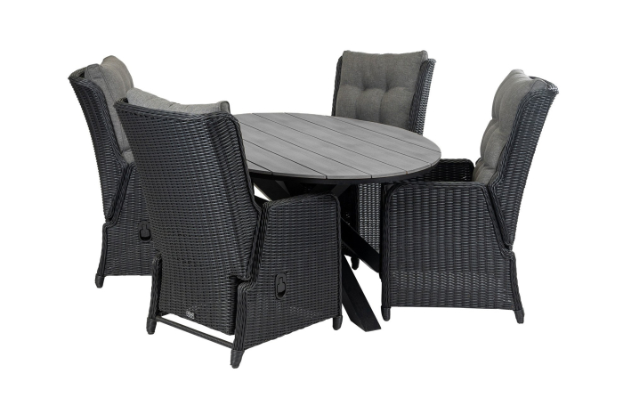 Ovales Gartenset | 4 verstellbare Dublin Gartenstühle (Schwarz) | Limasol Polywood Gartentisch 180 cm (Grau)