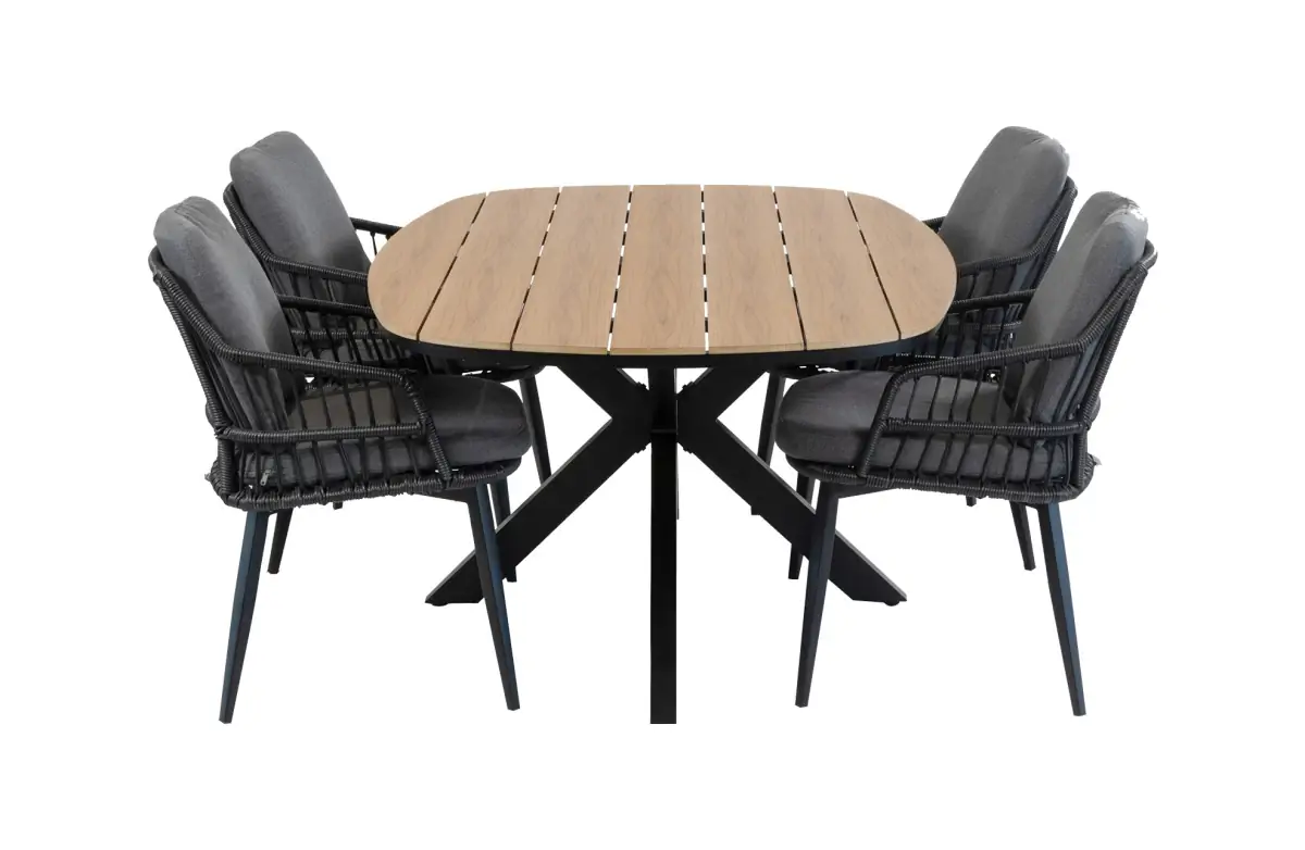 5-teiliges Garten-Set | 4 Gartenstühle Isabel (Sand/Wood) | Gartentisch Tower 180 x 115 cm (Camel)