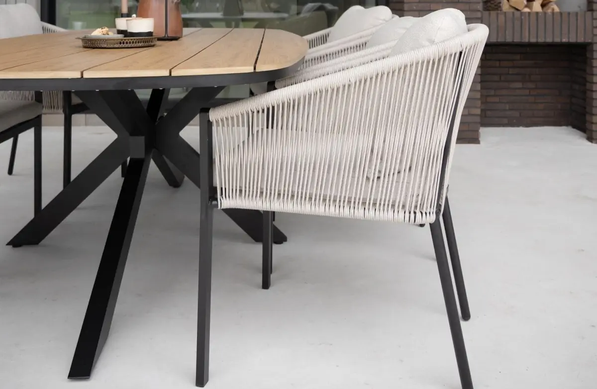 Die Tischplatte mit einer Länge von 180 cm besteht aus Tecon Teak, einem hochwertigen Material, das das warme Aussehen von echtem Teakholz mit der Pflegeleichtigkeit von Polywood verbindet. So behält der Tisch sein elegantes und natürliches Aussehen - ohne die intensive Pflege, die echtes Holz erfordert.
