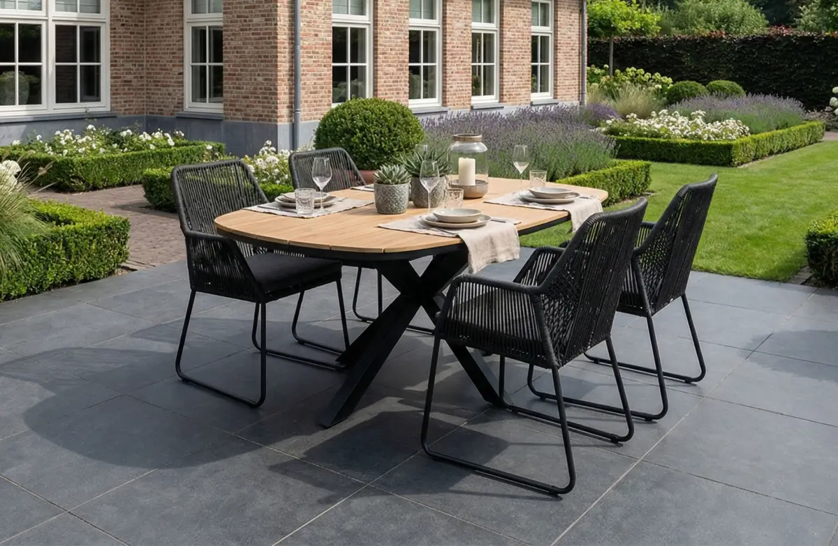 5-teiliges Garten-Set | 4 Mona Gartenstühle (Sand) | Cadiz Gartentisch 180 x 115 cm (Schwarz)