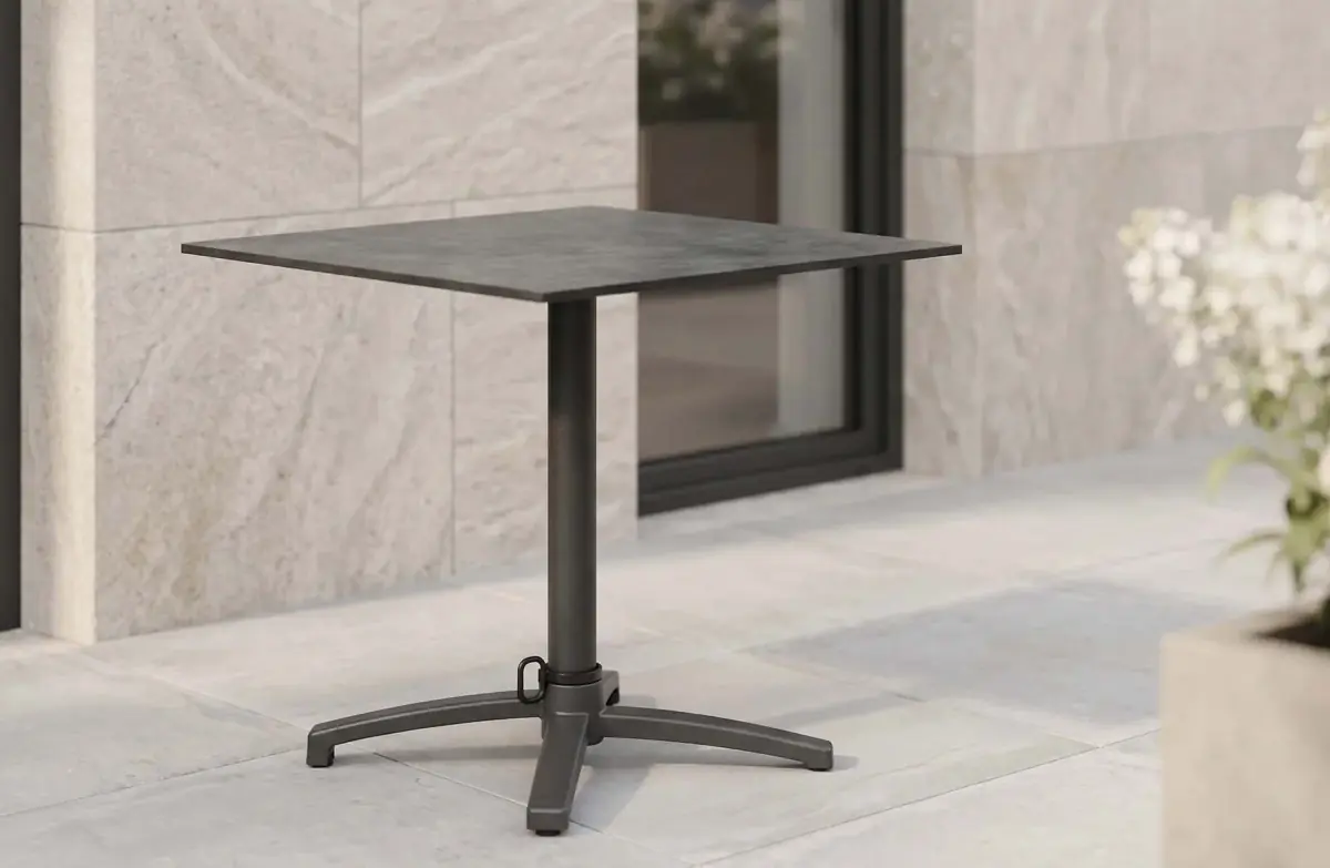 Dank des cleveren Klappsystems lässt sich der Gent-Terrassentisch leicht zusammenklappen und verstauen - ideal für Geschäftsterrassen, bei denen Platzmanagement wichtig ist. Aber auch wenn Sie einen Balkon oder einen kleinen Garten haben, ist dieser klappbare Gartentisch ideal. Die Tischplatte aus HPL bietet genügend Platz für gemütliche Runden, und die strapazierfähigen Materialien sorgen dafür, dass der Tisch einer intensiven Nutzung und verschiedenen Witterungsbedingungen standhält.