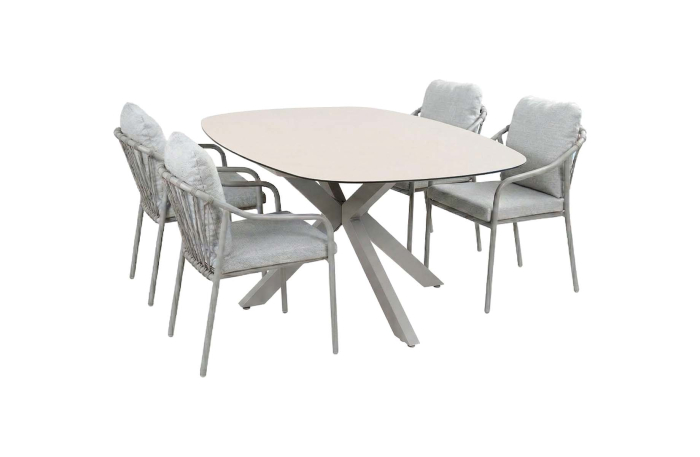 Das Set wird ergänzt durch vier Paris Dining-Gartenstühle in Elfenbeinfarbe & Camel, die modernes Design mit hohem Sitzkomfort verbinden. Das leichte Aluminiumgestell macht die Stühle einfach zu bewegen, während das straff gespannte Rope in der Rückenlehne sich angenehm an den Rücken anpasst und natürliche Unterstützung bietet. Die mitgelieferten Sitz- und Rückenkissen erhöhen den Komfort zusätzlich, sodass Sie auch über längere Zeit bequem sitzen können.