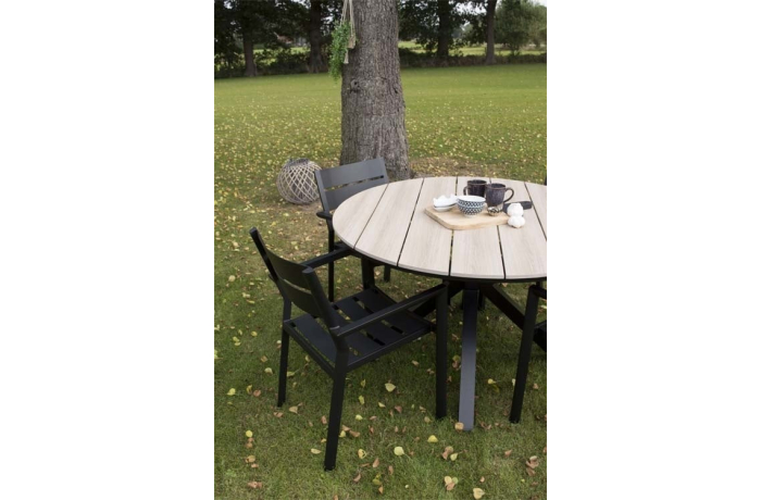 Der runde Gartentisch, der zu diesem Set gehört, hat eine Platte aus Polywood mit einem Kreuzfuß aus Aluminium. Durch die Verwendung dieser Materialien ist der Tisch leicht zu bewegen und pflegeleicht. Wir empfehlen, den Tisch bei längerer Nutzungspause oder schlechten Witterungsverhältnissen abzudecken, um seine Lebensdauer zu verlängern. Zu diesem Zweck bieten wir passende Schutzhüllen an.