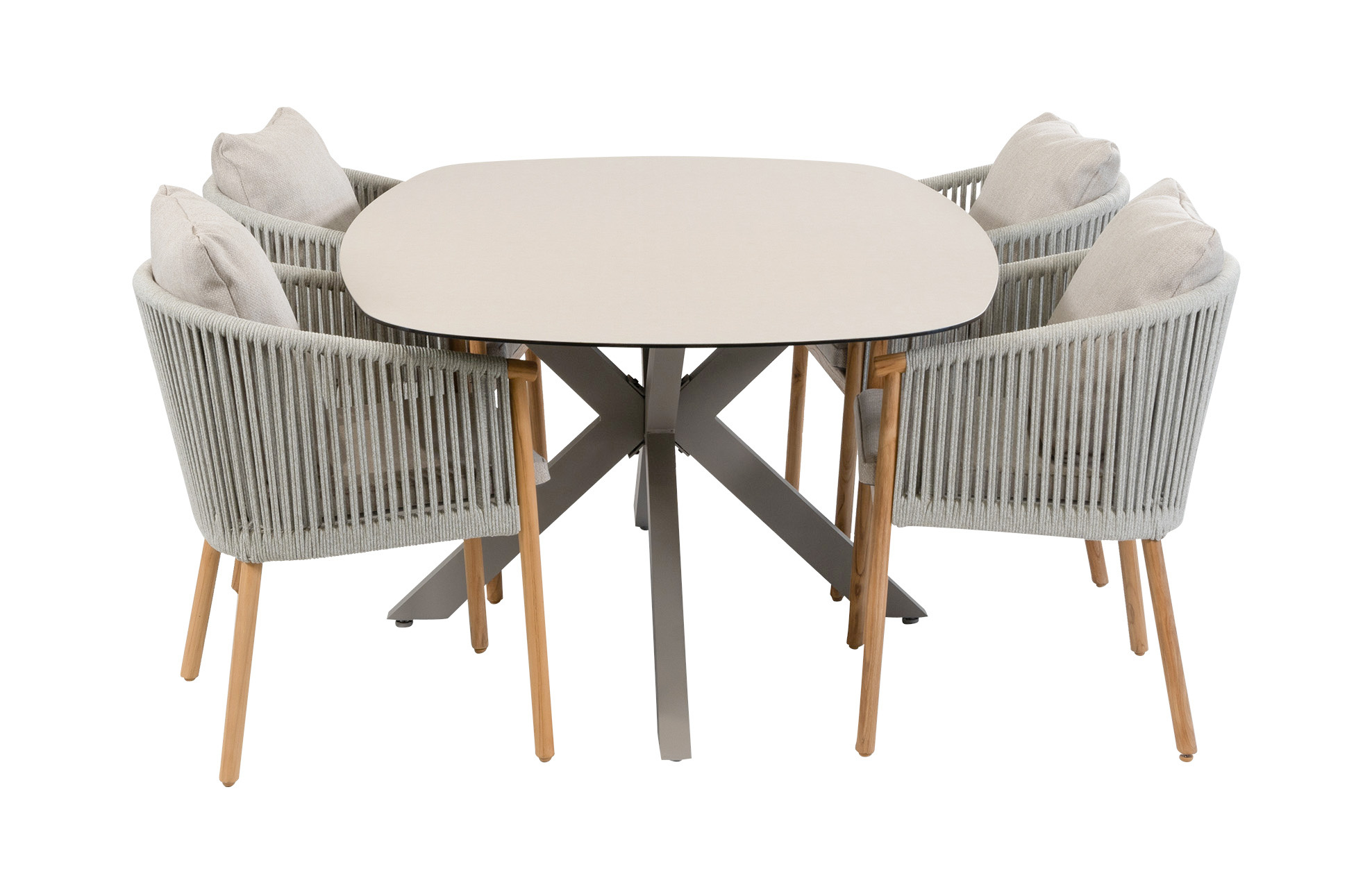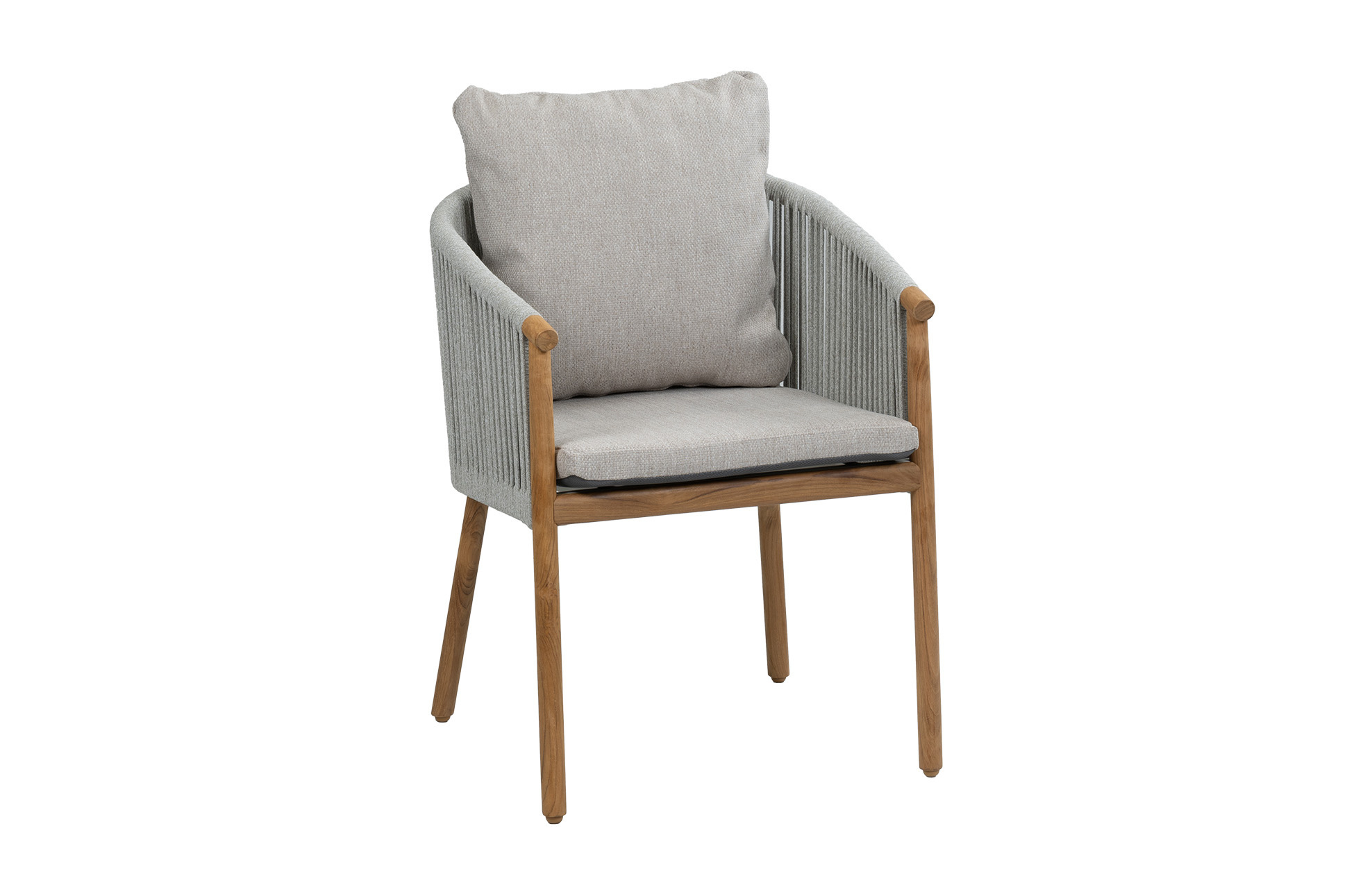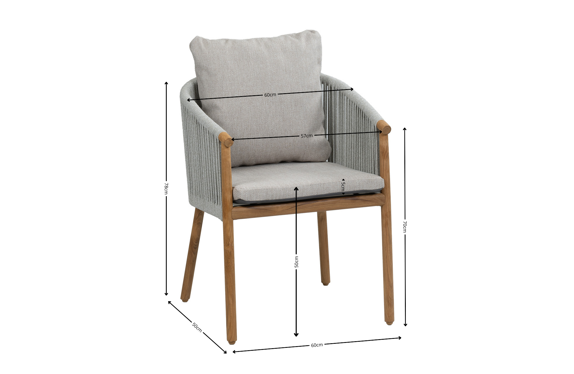 Die Es Vedra-Gartenstühle sind aus robustem Teakholz gefertigt und strahlen natürlichen Luxus aus. Die Rückenlehne ist mit flexiblem und witterungsbeständigem Seil in einem raffinierten hellgrauen Farbton bespannt, der nicht nur einen modernen Look verleiht, sondern auch optimalen Halt bietet, indem er sich der natürlichen Form Ihres Rückens anpasst. Die Sitz- und Rückenkissen in der weichen Beigefarbe "Cream" sorgen für zusätzlichen Komfort. Die Kissen sind wasserabweisend, aber um die Lebensdauer zu verlängern, empfehlen wir, sie bei Regen im Haus aufzubewahren.