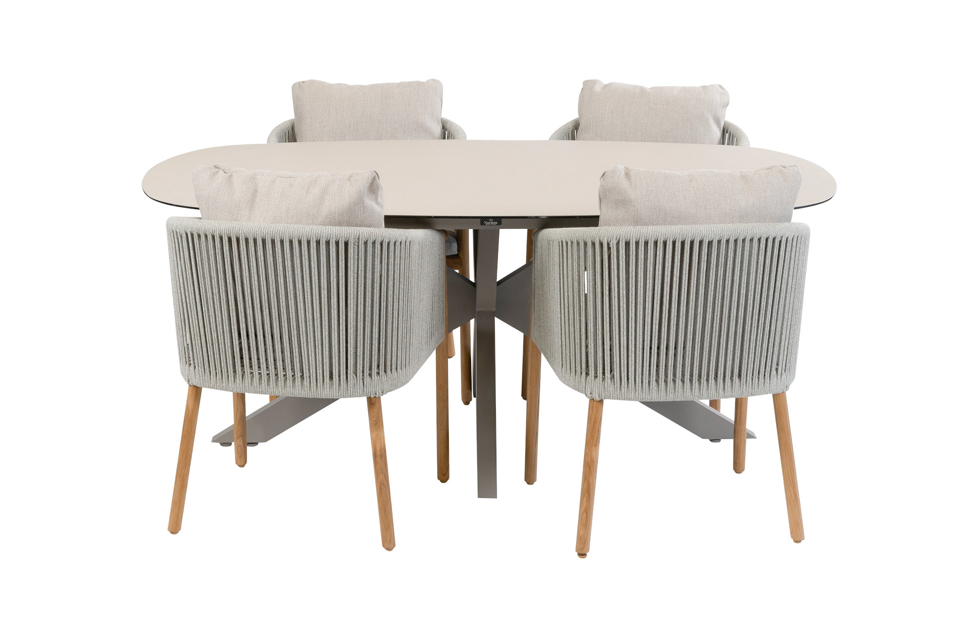 Entdecken Sie den robusten Gartentisch Malaga im kompakten Format von 180 x 115 cm. Dieser Tisch kombiniert Raffinesse und Funktionalität mit einer eleganten, bootsförmigen Tischplatte, die Ihrer Terrasse einen einzigartigen Look verleiht. Die Platte ist in dem warmen Erdton Cerra Vetro gehalten und besteht aus einer Mischung aus Keramik und Glas. Dieses Material ist sowohl stilvoll als auch robust, witterungsbeständig und leicht zu pflegen.