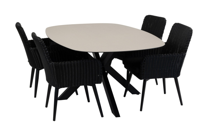 Dieser Stuhl wird kombiniert mit dem robusten Gartentisch Malaga im Format von 180 x 115 cm - perfekt für eine große Terrasse. Dieser Tisch kombiniert Raffinesse und Funktionalität mit einer eleganten, bootsförmigen Tischplatte, die Ihrer Terrasse einen einzigartigen Look verleiht. Die Platte ist in dem warmen Erdton Cerra Vetro gehalten und besteht aus einer Mischung aus Keramik und Glas. Dieses Material ist sowohl stilvoll als auch robust, witterungsbeständig und leicht zu pflegen.