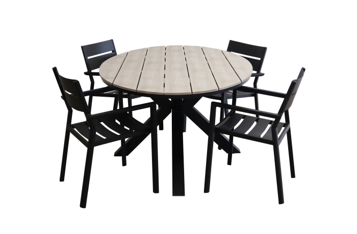 Rundes Gartenset 4 Personen | Delia stapelbare Gartenstühle (Schwarz) | Limasol Polywood Gartentisch ø 120 cm (Wood)