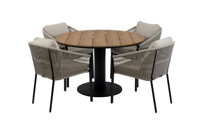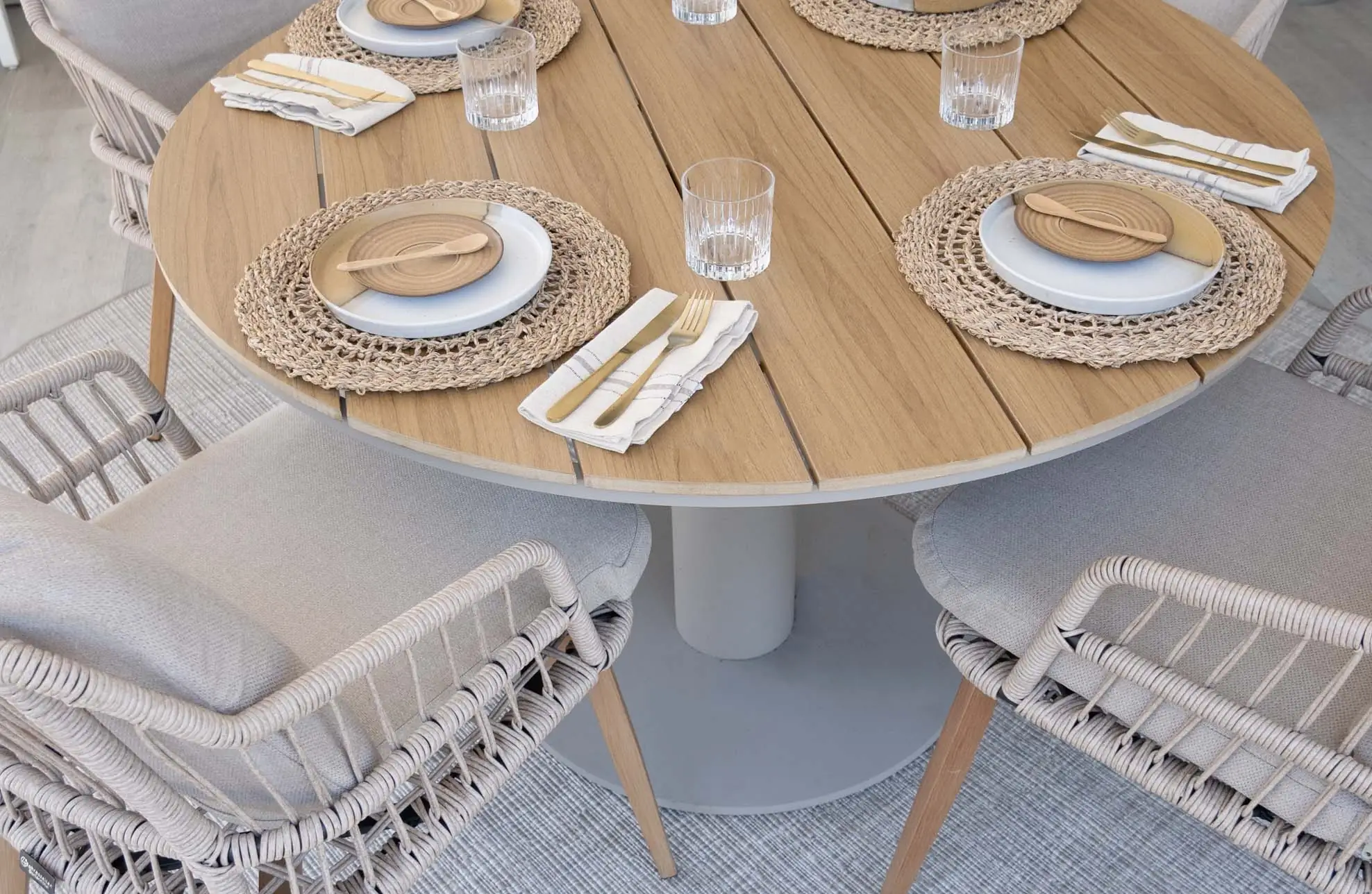 Die Tischplatte mit einem Durchmesser von ø 120 cm besteht aus Tecon Teak, einem hochwertigen Material, das das warme Aussehen von echtem Teakholz mit der Pflegeleichtigkeit von Polywood verbindet. So behält der Tisch sein elegantes und natürliches Aussehen - ohne die intensive Pflege, die echtes Holz erfordert.