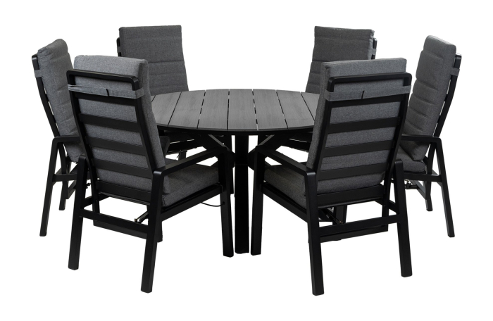 Rundes 7-teiliges Garten-Set | 6 Berlin Gartenstühle (Schwarz) | Limasol Gartentisch ø 150 cm (Grau)