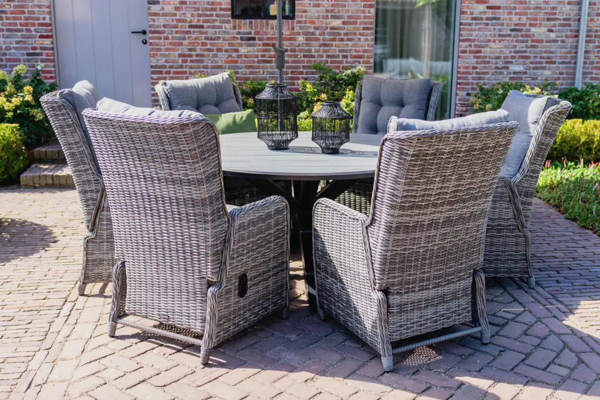 Der runde Gartentisch, der zu diesem Set gehört, hat eine Platte aus Polywood mit einem Kreuzfuß aus Aluminium. Durch die Verwendung dieser Materialien ist der Tisch leicht zu bewegen und pflegeleicht. Wir empfehlen, den Tisch bei längerer Nutzungspause oder schlechten Witterungsverhältnissen abzudecken, um seine Lebensdauer zu verlängern. Zu diesem Zweck bieten wir passende Schutzhüllen an.