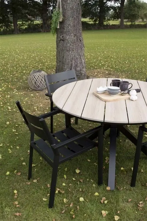 Der runde Gartentisch, der zu diesem Set gehört, hat eine Platte aus Polywood mit einem Kreuzfuß aus Aluminium. Durch die Verwendung dieser Materialien ist der Tisch leicht zu bewegen und pflegeleicht. Wir empfehlen, den Tisch bei längerer Nutzungspause oder schlechten Witterungsverhältnissen abzudecken, um seine Lebensdauer zu verlängern. Zu diesem Zweck bieten wir passende Schutzhüllen an.