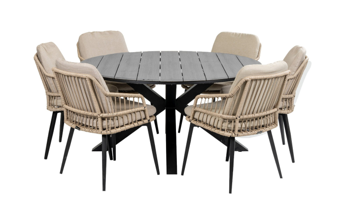 Rundes Gartenset 6 Personen | Isabel Rope Gartenstühle (Sand) | Limasol Polywood Gartentisch ø 150 cm (Grau)