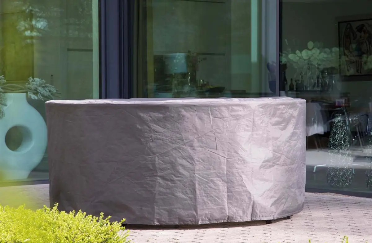 Der runde Gartentisch, der zu diesem Set gehört, hat eine Platte aus Polywood mit einem Kreuzfuß aus Aluminium. Durch die Verwendung dieser Materialien ist der Tisch leicht zu bewegen und pflegeleicht. Wir empfehlen, den Tisch bei längerer Nutzungspause oder schlechten Witterungsverhältnissen abzudecken, um seine Lebensdauer zu verlängern. Zu diesem Zweck bieten wir passende Schutzhüllen an.