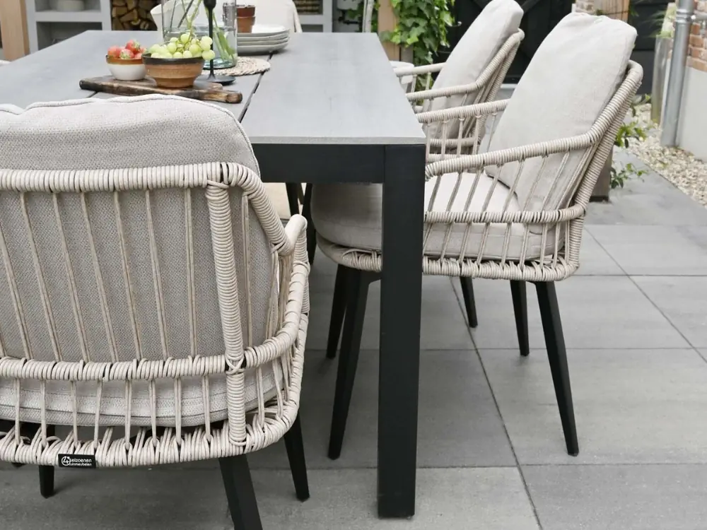 Durch die Verwendung langlebiger Materialien wie dem pulverbeschichteten Aluminiumrahmen und dem Geflecht aus Kunststoffseilen ist dieses Gartenset sehr pflegeleicht. Der Stuhl ist mit lauwarmem Wasser, einer weichen Bürste und grüner Seife leicht zu reinigen. Vermeiden Sie aggressive Reinigungsmittel mit ätzenden Substanzen sowie den Hochdruckreiniger. Dies kann die Materialien beschädigen.