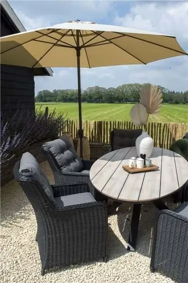 Der Gartentisch, der zu diesem Set gehört, hat eine Platte aus Polywood mit einem Kreuzfuß aus Aluminium. Durch die Verwendung dieser Materialien ist der Tisch leicht zu bewegen und pflegeleicht. Wir empfehlen, den Tisch bei längerer Nutzungspause oder schlechten Witterungsverhältnissen abzudecken, um seine Lebensdauer zu verlängern. Zu diesem Zweck bieten wir passende Schutzhüllen an.