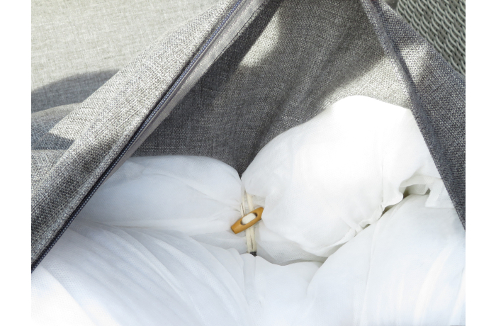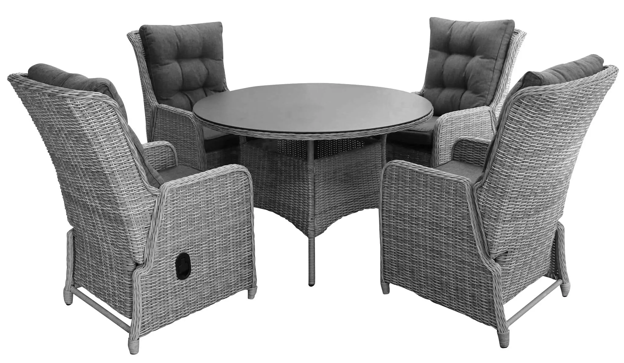 Bequemer Esszimmer-Gartenstuhl aus rundem Geflecht auf einem Aluminiumrahmen. Der Stuhl ist mit einem grauen Sitz- und Rückenkissen ausgestattet, das abnehmbar und somit waschbar ist. Der Stuhl ist aus langlebigen Materialien gefertigt und daher wartungsfrei. Dieser Gartenstuhl ist das ganze Jahr über für den Außenbereich geeignet. Dieser Stuhl ist ein luxuriöser Esszimmerstuhl aus Geflecht, der sich gut mit vielen Gartentischen kombinieren lässt, z. B. aus Teakholz, Granit, aber auch aus Geflecht. Der Stuhl kann mit Hilfe einer Gasfeder in jede beliebige Position gebracht werden.