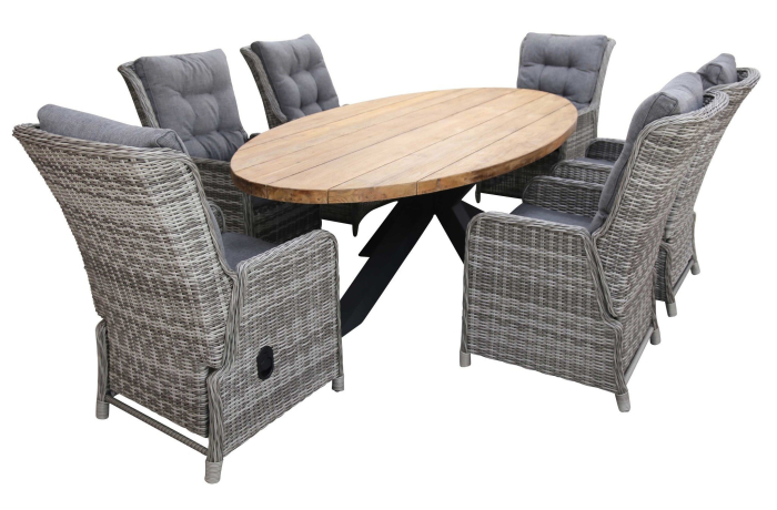 Palu Teakholz oval Gartentisch 300x130cm mit 6 verstellbaren Dublin Gartenstühlen (Ash Grey)
