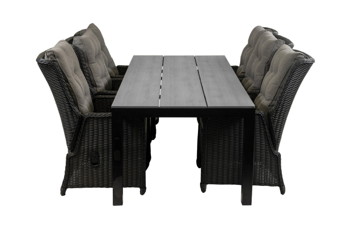 Gartenset für 6 Personen | Dublin verstellbare Gartenstühle (Schwarz) | Limasol Polywood Gartentisch 225 cm (Wood)