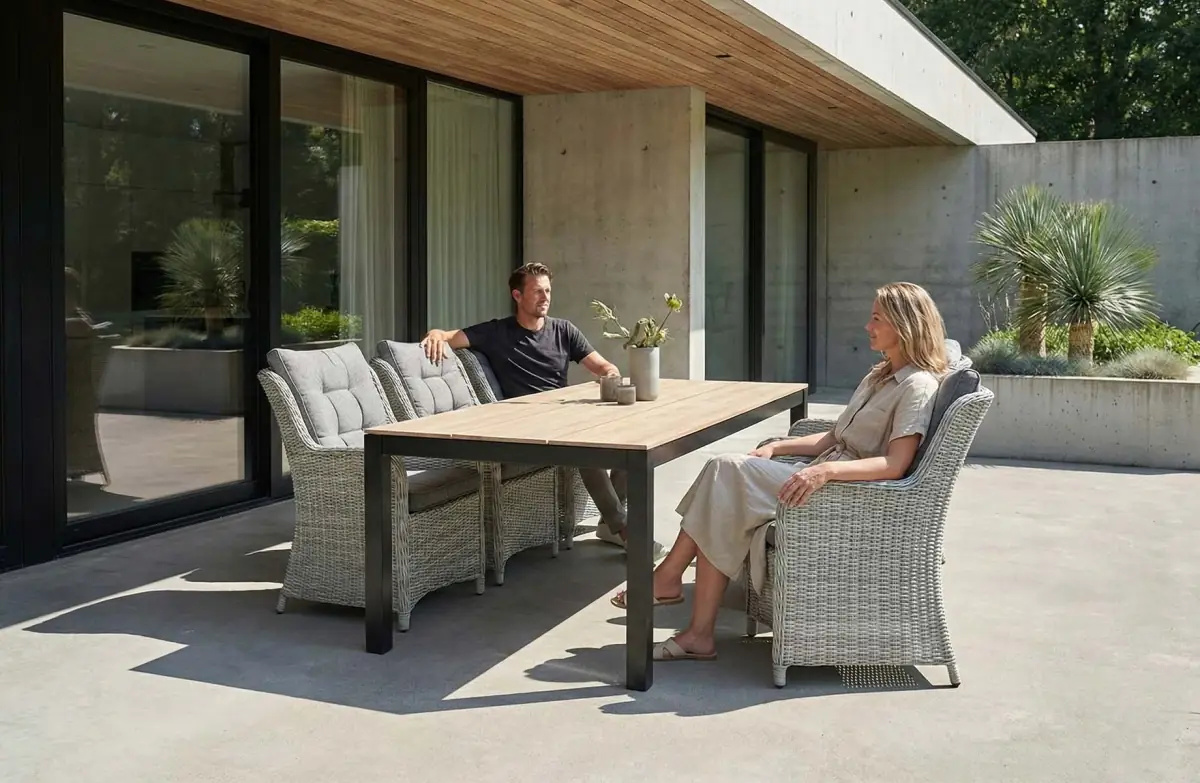 Der Gartentisch, der zu diesem Set gehört, hat eine Platte aus Polywood mit einem Kreuzfuß aus Aluminium. Durch die Verwendung dieser Materialien ist der Tisch leicht zu bewegen und pflegeleicht. Wir empfehlen, den Tisch bei längerer Nutzungspause oder schlechten Witterungsverhältnissen abzudecken, um seine Lebensdauer zu verlängern. Zu diesem Zweck bieten wir passende Schutzhüllen an.