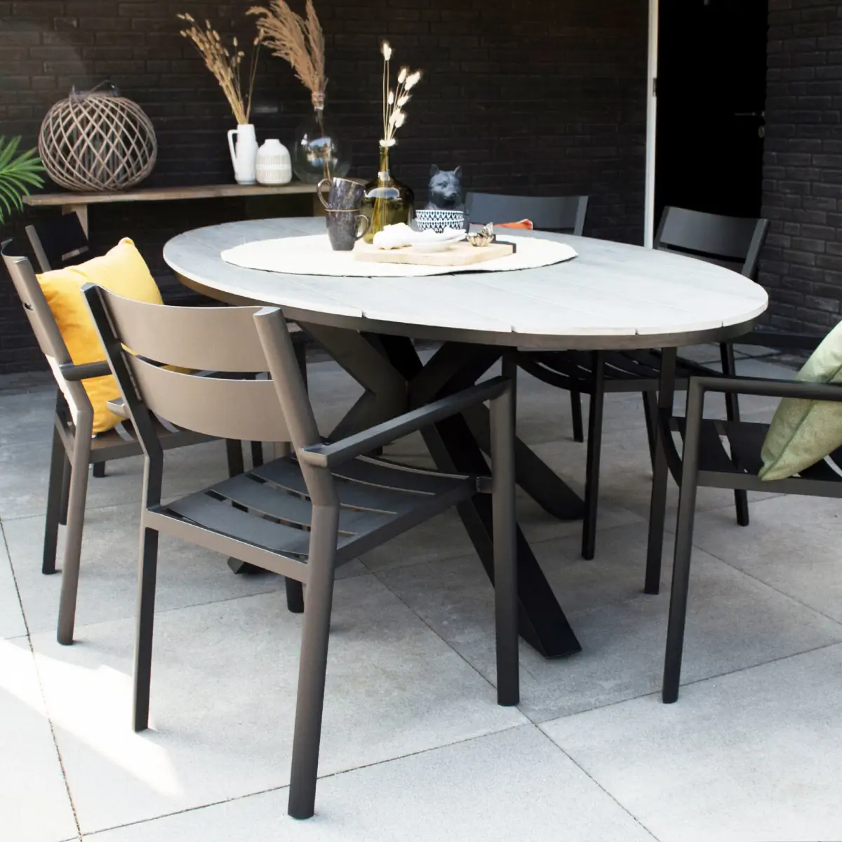 Der Gartentisch, der zu diesem Set gehört, hat eine Platte aus Polywood mit einem Kreuzfuß aus Aluminium. Durch die Verwendung dieser Materialien ist der Tisch leicht zu bewegen und pflegeleicht. Wir empfehlen, den Tisch bei längerer Nutzungspause oder schlechten Witterungsverhältnissen abzudecken, um seine Lebensdauer zu verlängern. Zu diesem Zweck bieten wir passende Schutzhüllen an.