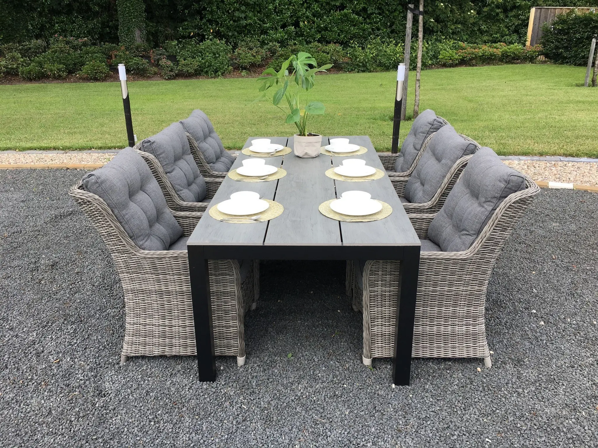 Der Gartentisch, der zu diesem Set gehört, hat eine Platte aus Polywood mit einem Kreuzfuß aus Aluminium. Durch die Verwendung dieser Materialien ist der Tisch leicht zu bewegen und pflegeleicht. Wir empfehlen, den Tisch bei längerer Nutzungspause oder schlechten Witterungsverhältnissen abzudecken, um seine Lebensdauer zu verlängern. Zu diesem Zweck bieten wir passende Schutzhüllen an.