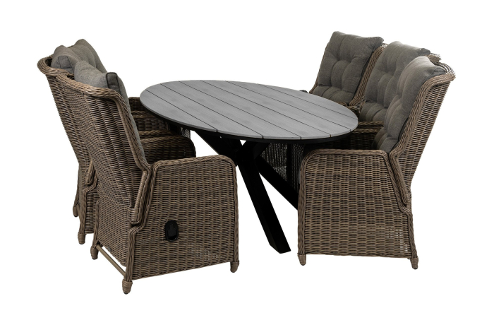 Ovales Gartenset | 6 verstellbare Dublin Gartenstühle (Sweet Brown) | Limasol Polywood Gartentisch 220 cm (Grau)