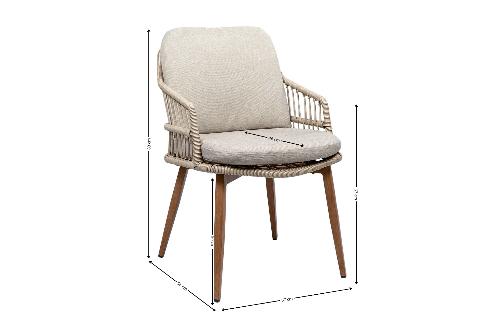 Die Isabel Gartenstühle sind die perfekte Ergänzung zum Rock Gartentisch. Sie sind mit einem Kunststoffseil bespannt, einem Material, das nicht nur flexibel und stark, sondern auch witterungsbeständig ist. Das Seil passt sich den natürlichen Kurven der Rückenlehne an und verleiht den Stühlen einen hervorragenden Komfort. Die geflochtene Optik der Stühle verleiht ihnen einen modernen Look, während die Aluminiumbeine in Holzoptik den natürlichen Charakter unterstreichen. Zusammen mit dem Gartentisch Rock schafft dieses Gartenset einen stilvollen und funktionellen Außenbereich, an dem Sie jahrelang Freude haben werden.