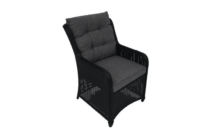 Bequemer Esszimmerstuhl aus halbrundem Geflecht auf einem Aluminiumrahmen. Der Stuhl hat ein graues Sitz- und Rückenkissen, das mit einem Reißverschluss abgenommen werden kann und somit waschbar ist. Der Stuhl ist aus langlebigen Materialien gefertigt und daher wartungsfrei. Dieser Gartenstuhl ist das ganze Jahr über für den Außenbereich geeignet. Dieser Stuhl ist ein luxuriöser Esszimmerstuhl aus Geflecht, der sich gut mit vielen Gartentischen kombinieren lässt, z. B. aus Teakholz, Granit, aber auch aus Geflecht.