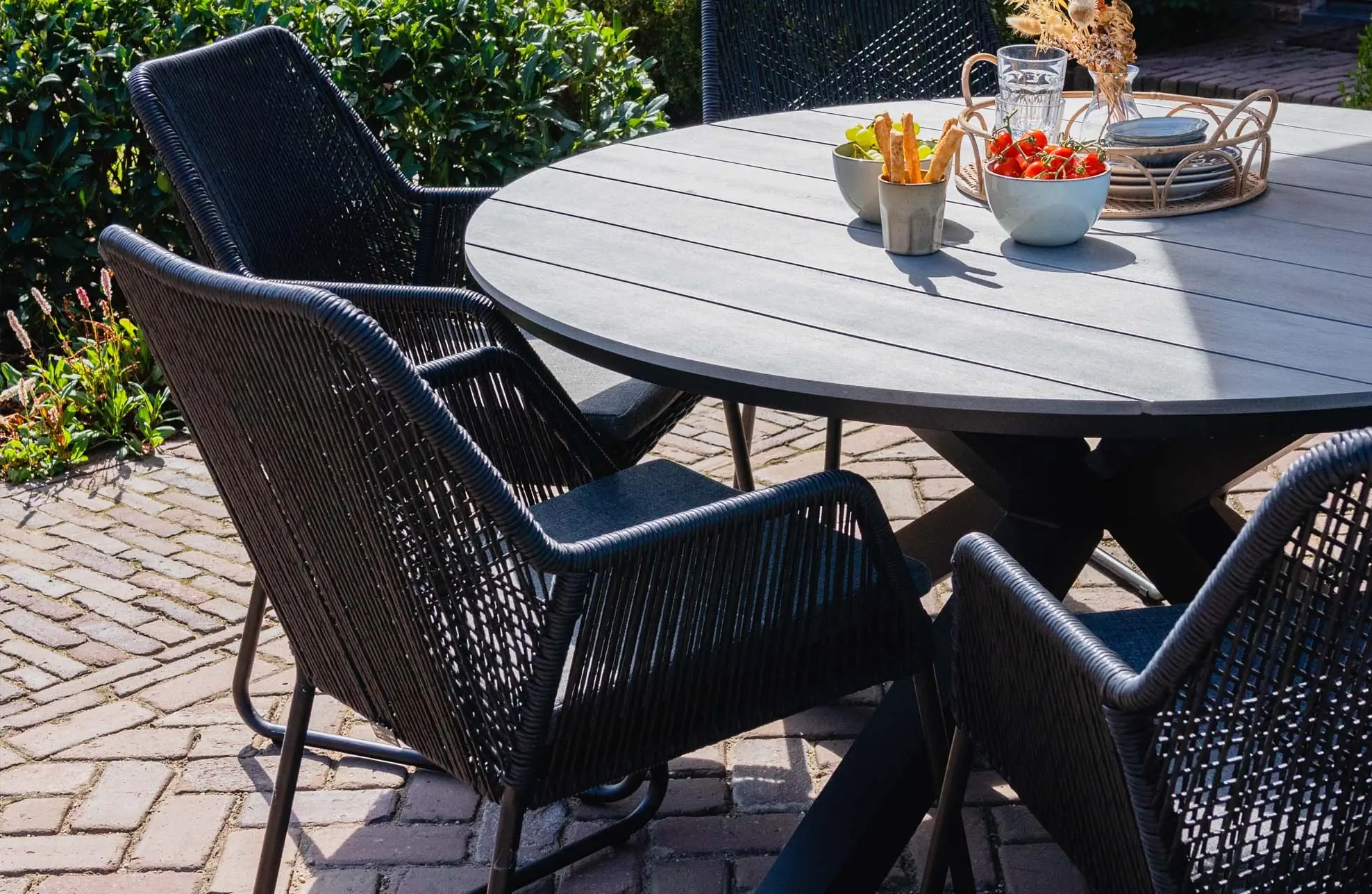 Mit dem runden Gartentisch Limasol wird das Essen im Freien zu einem echten Erlebnis. Der Gartentisch fällt sofort durch seine elegante, runde Form auf, die nicht nur schön aussieht, sondern auch praktisch ist. Der runde Tisch erlaubt es allen, bequem um ihn herum zu sitzen, ohne dass enge Linien oder Ecken das Zusammensein behindern. Die Tischplatte besteht aus hochwertigem Polywood, einem wartungsfreien Material, das für sein natürliches Aussehen und seine Langlebigkeit bekannt ist. Das Material ist UV-beständig und leicht zu reinigen, so dass Sie jahrelang Freude an diesem Tisch haben werden. Das schwarz pulverbeschichtete X-Fuß-Gestell aus Aluminium verleiht dem Tisch ein cooles und modernes Aussehen, während es gleichzeitig für Stabilität und Robustheit sorgt. Dieses zeitlose Design passt perfekt zu verschiedenen Gartenstilen, von modern bis ländlich.