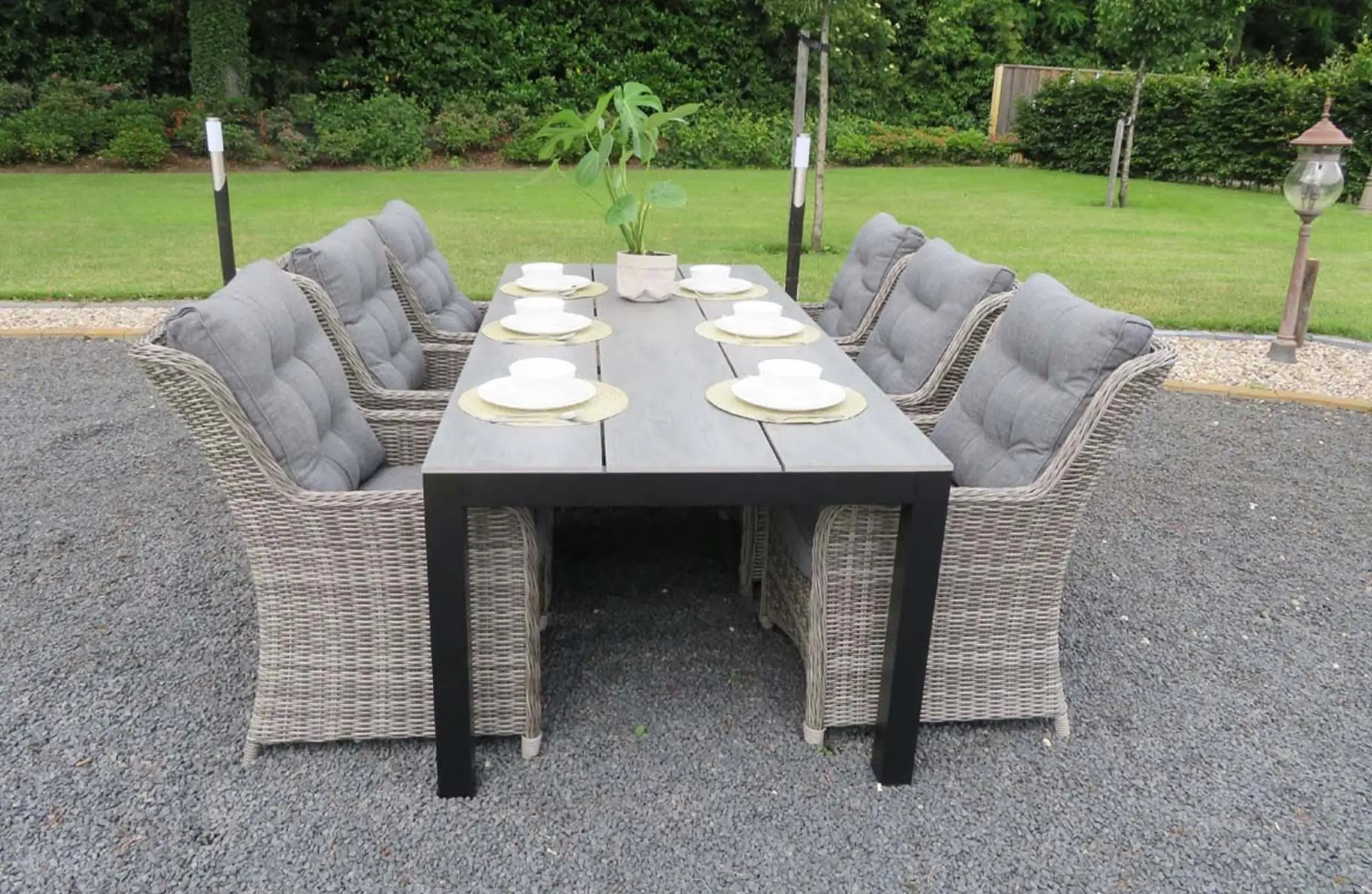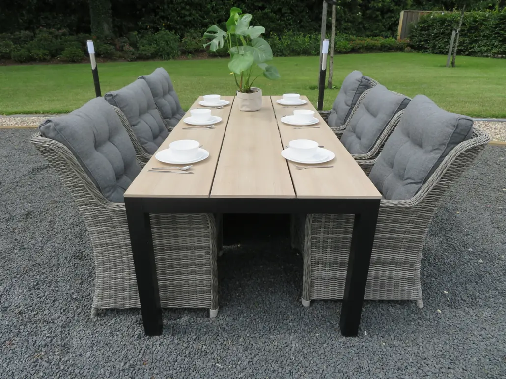 Der Gartentisch, der zu diesem Set gehört, hat eine Platte aus Polywood mit einem Kreuzfuß aus Aluminium. Durch die Verwendung dieser Materialien ist der Tisch leicht zu bewegen und pflegeleicht. Wir empfehlen, den Tisch bei längerer Nutzungspause oder schlechten Witterungsverhältnissen abzudecken, um seine Lebensdauer zu verlängern. Zu diesem Zweck bieten wir passende Schutzhüllen an.