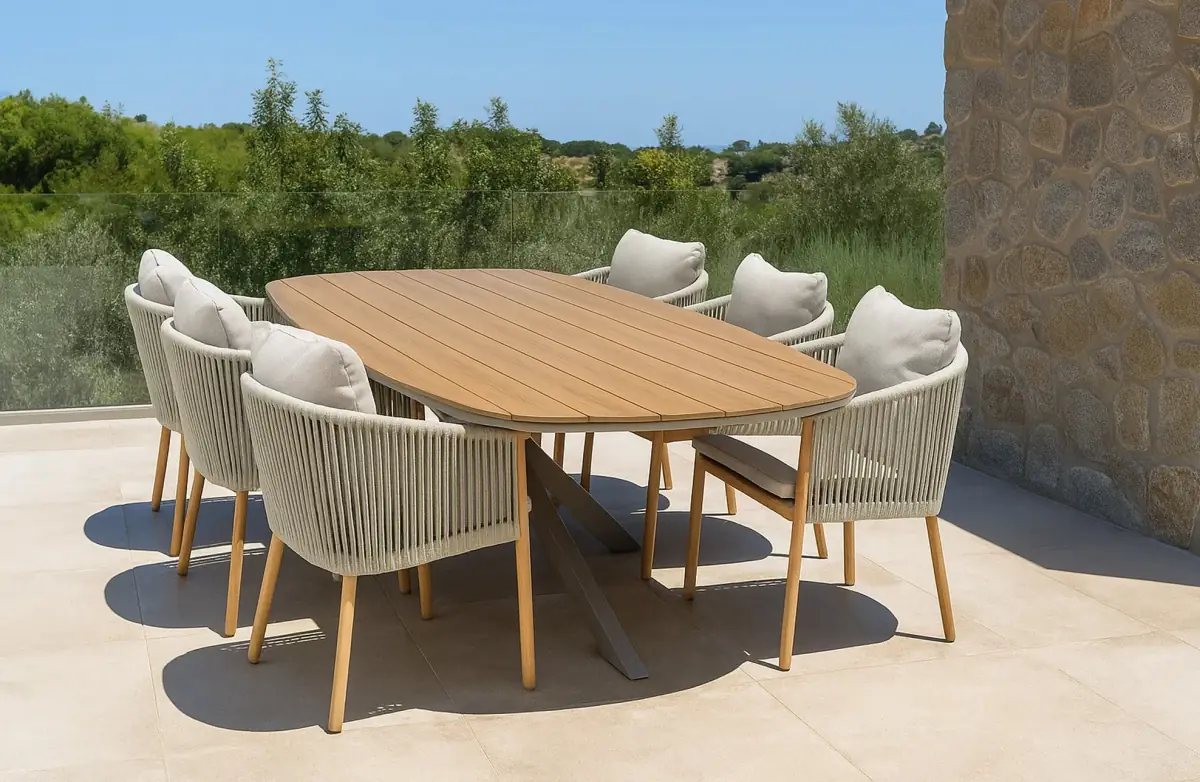 Der Gartentisch Cadiz ist eine elegante Wahl für großzügige Außenbereiche und eignet sich perfekt für ausgedehnte Abendessen und gesellige Zusammenkünfte. Mit einer Größe von 280 x 115 cm bietet dieser Tisch mehr als genug Platz für eine große Party, während die ovale Tischplatte einen verspielten, einladenden Look erzeugt. Die Tischplatte besteht aus Tecon Teak, einem pflegeleichten Material, das die warme, natürliche Ausstrahlung von echtem Teakholz ohne intensive Pflege nachahmt.