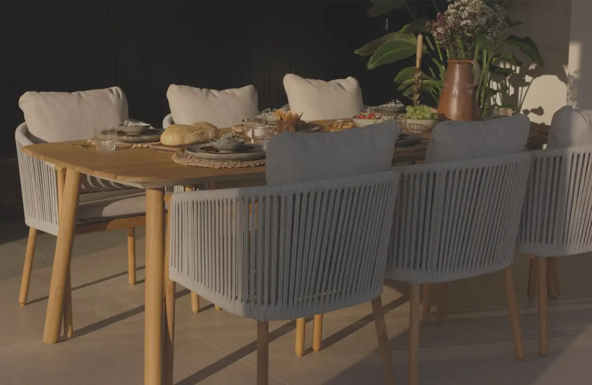 Die Tischplatte mit einer Länge von 260 cm besteht aus Tecon Teak, einem hochwertigen Material, das das warme Aussehen von echtem Teakholz mit der Pflegeleichtigkeit von Polywood verbindet. So behält der Tisch sein elegantes und natürliches Aussehen - ohne die intensive Pflege, die echtes Holz erfordert.