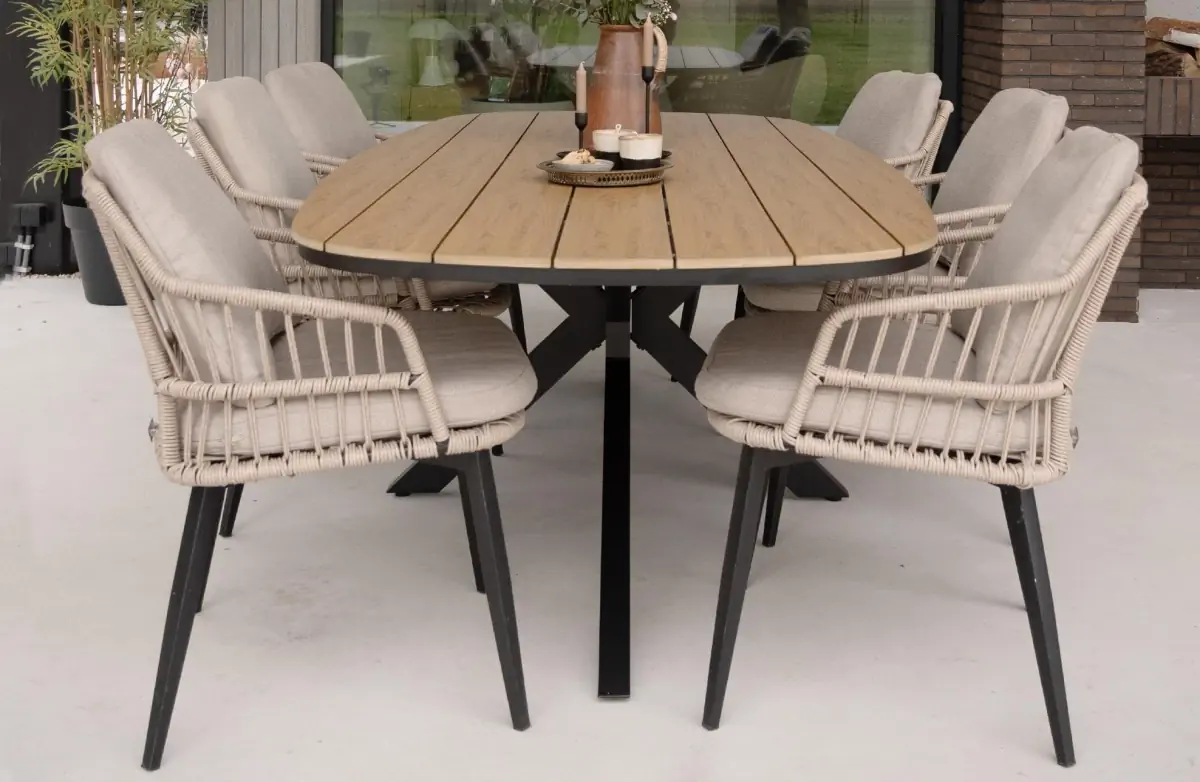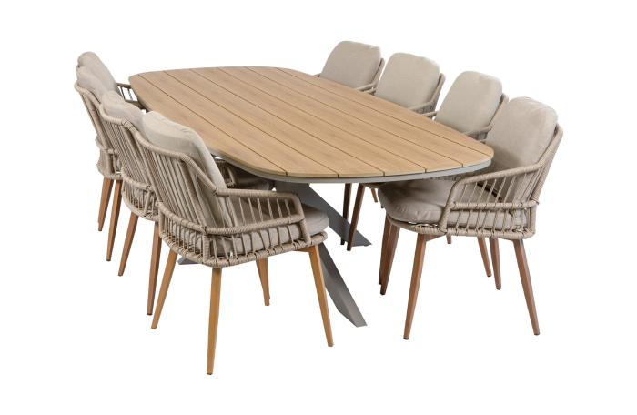 9-teiliges Garten-Set | 8 Gartenstühle Isabel (Sand/Wood) | Gartentisch Cadiz 280 x 115 cm (Camel)