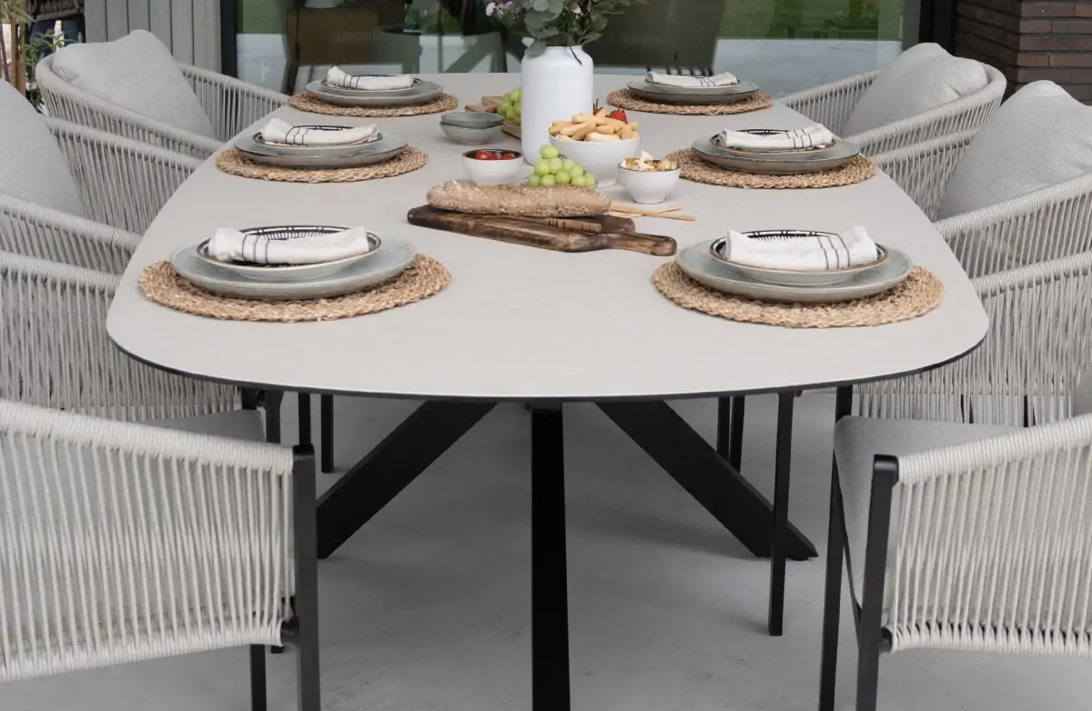 Entdecken Sie den großen, robusten Gartentisch Malaga im großen Format von 280 x 115 cm - perfekt für eine große Terrasse. Dieser Tisch kombiniert Raffinesse und Funktionalität mit einer eleganten, bootsförmigen Tischplatte, die Ihrer Terrasse einen einzigartigen Look verleiht. Die Platte ist in dem warmen Erdton Cerra Vetro gehalten und besteht aus einer Mischung aus Keramik und Glas. Dieses Material ist sowohl stilvoll als auch robust, witterungsbeständig und leicht zu pflegen.