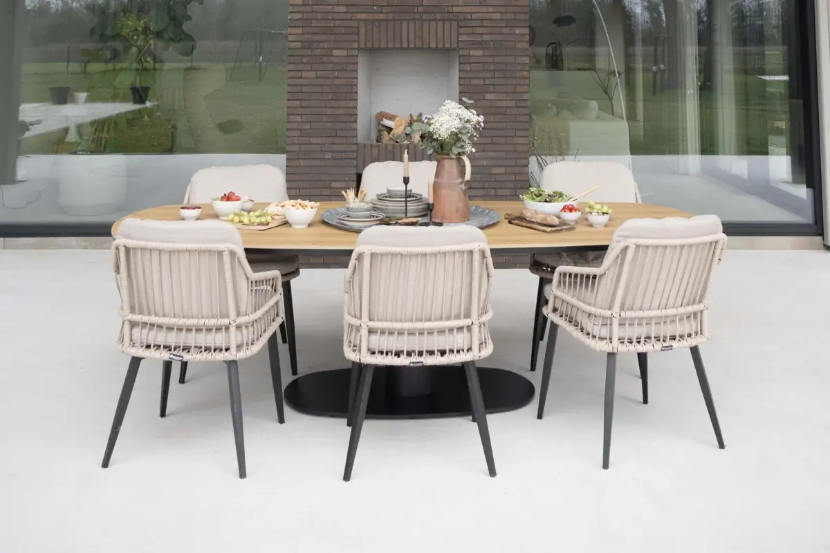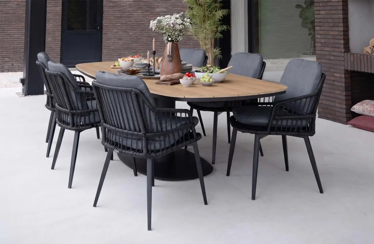 Die Tischplatte mit einer Länge von 260 cm besteht aus Tecon Teak, einem hochwertigen Material, das das warme Aussehen von echtem Teakholz mit der Pflegeleichtigkeit von Polywood verbindet. So behält der Tisch sein elegantes und natürliches Aussehen - ohne die intensive Pflege, die echtes Holz erfordert.