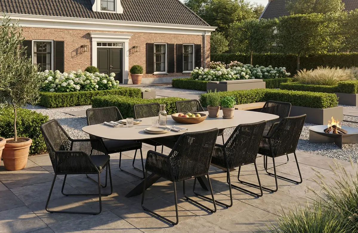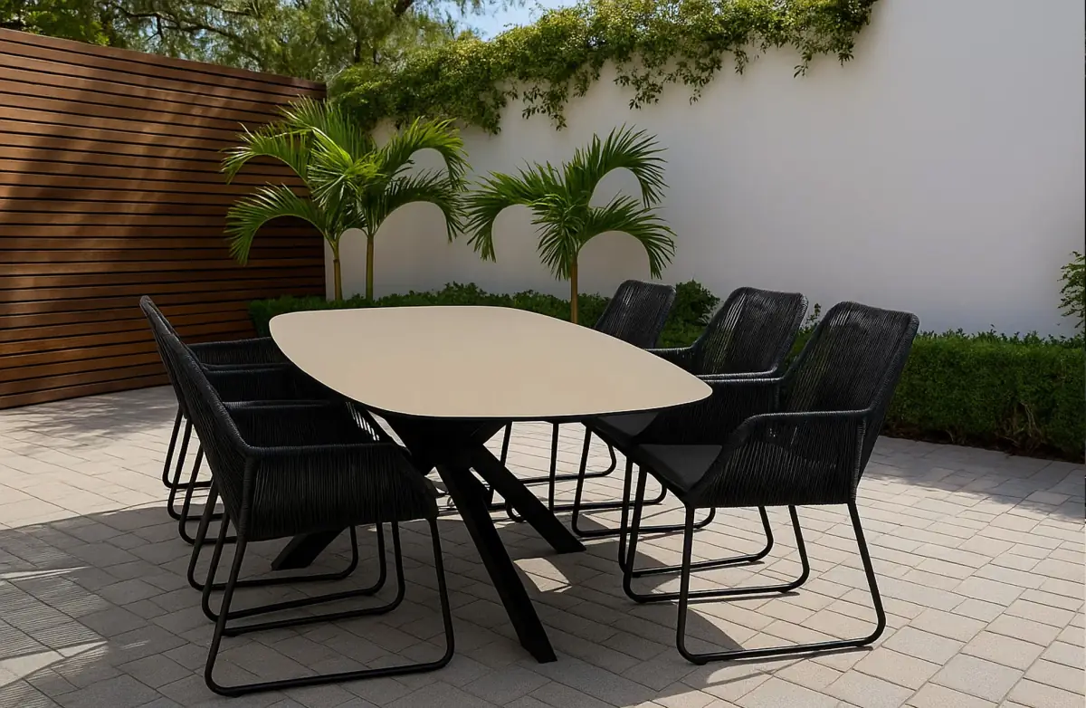 Dieser Stuhl wird kombiniert mit dem großen, robusten Gartentisch Malaga im großen Format von 280 x 115 cm - perfekt für eine große Terrasse. Dieser Tisch kombiniert Raffinesse und Funktionalität mit einer eleganten, bootsförmigen Tischplatte, die Ihrer Terrasse einen einzigartigen Look verleiht. Die Platte ist in dem warmen Erdton Cerra Vetro gehalten und besteht aus einer Mischung aus Keramik und Glas. Dieses Material ist sowohl stilvoll als auch robust, witterungsbeständig und leicht zu pflegen.