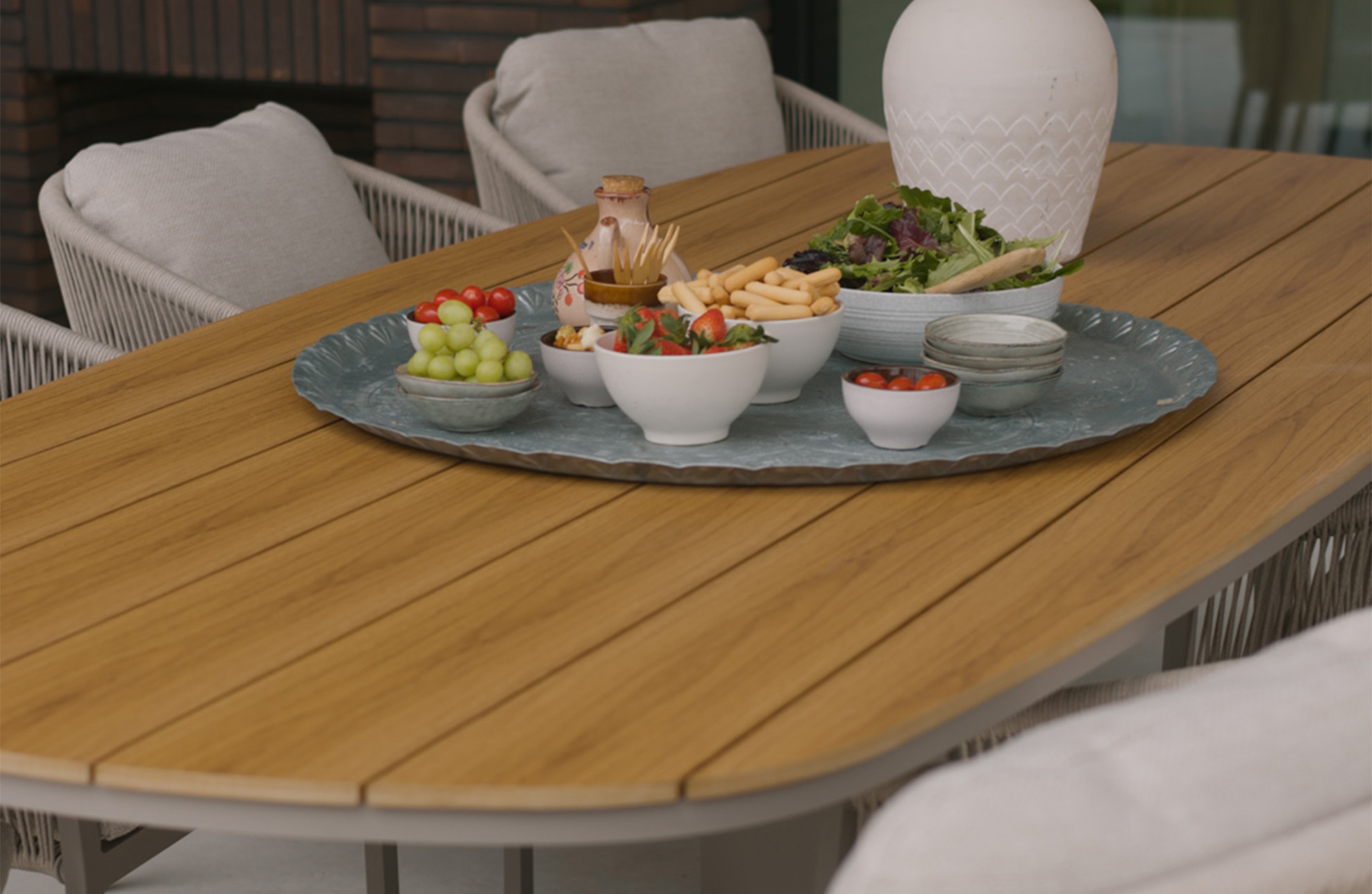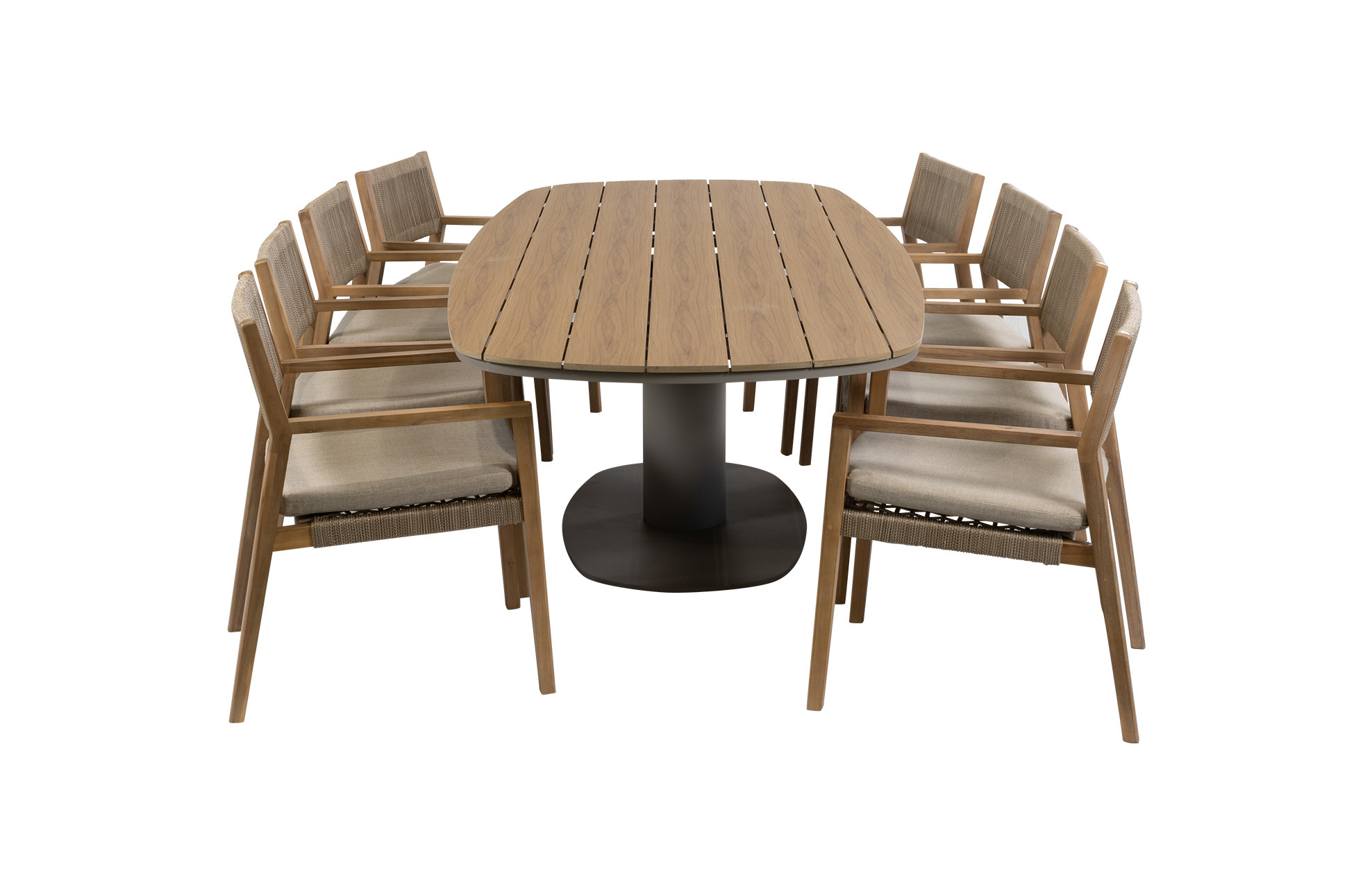 Die Tischplatte mit einer Länge von 260 cm besteht aus Tecon Teak, einem hochwertigen Material, das das warme Aussehen von echtem Teakholz mit der Pflegeleichtigkeit von Polywood verbindet. So behält der Tisch sein elegantes und natürliches Aussehen - ohne die intensive Pflege, die echtes Holz erfordert.