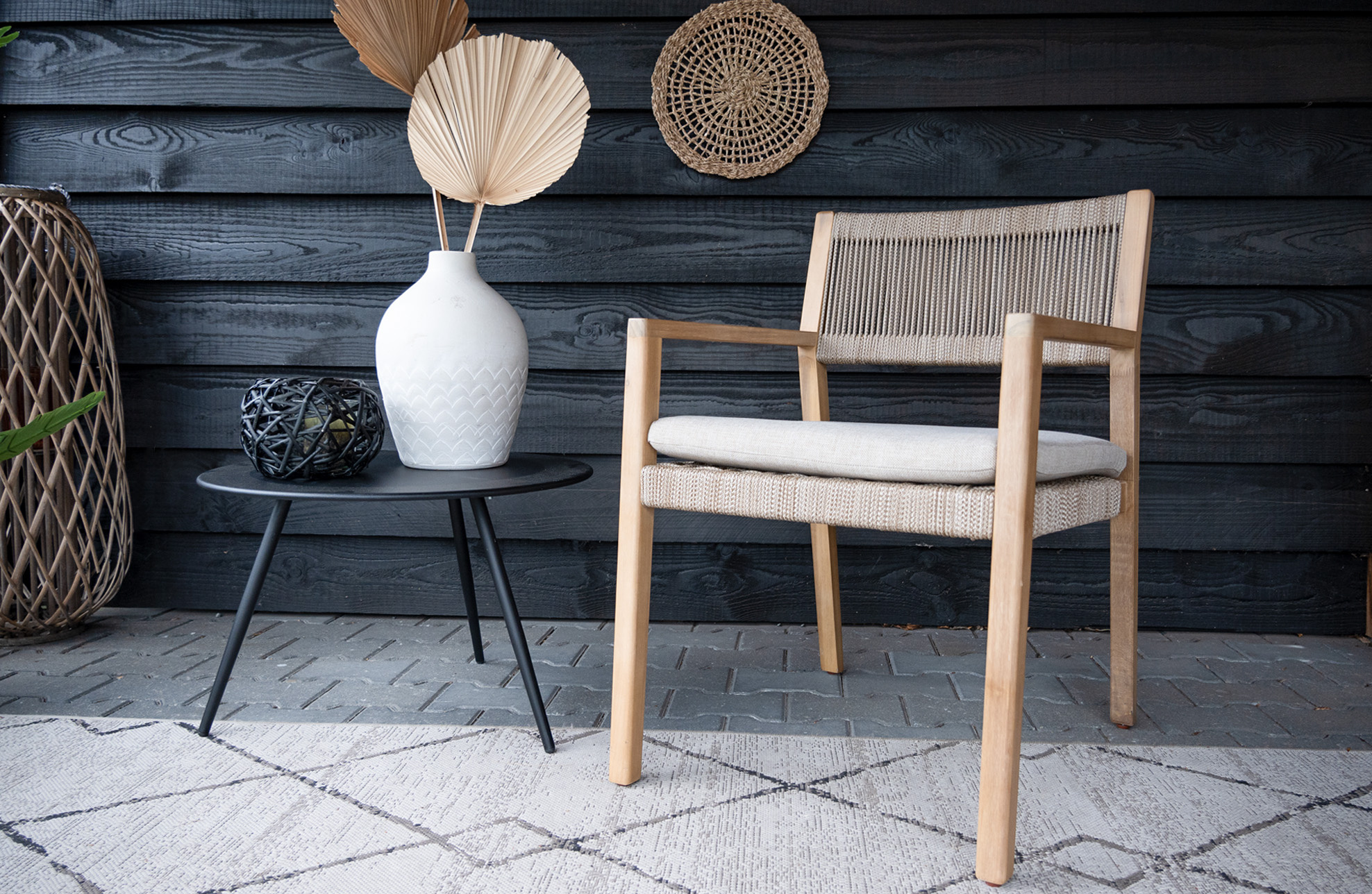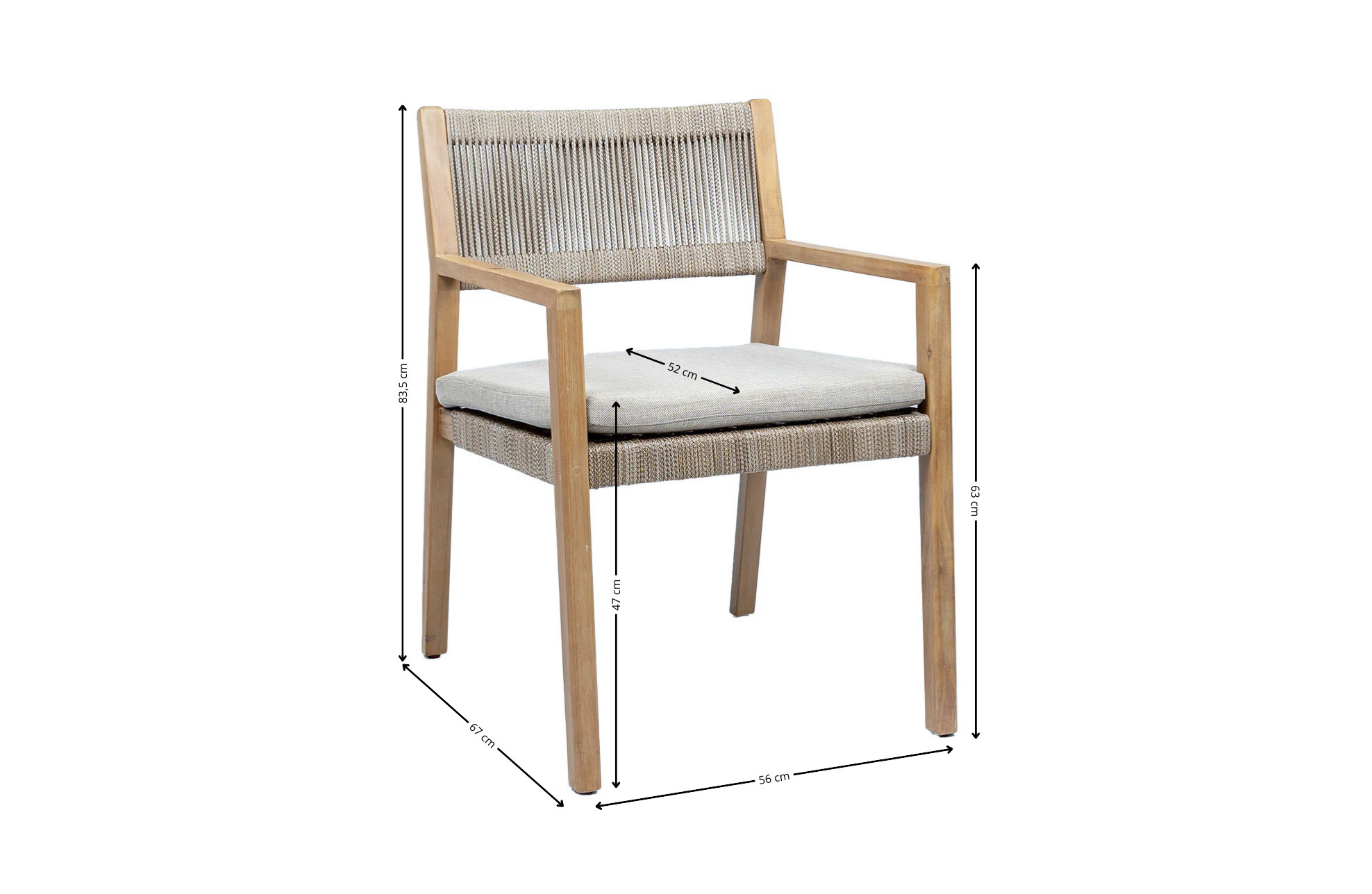 Der Gartenstuhl Felline ist aus Akazienholz gefertigt. Diese Hartholzart ist sehr stark, witterungsbeständig und langlebig. Entdecken Sie ein einzigartiges Design mit geflochtenem Seil an Sitz und Rückenlehne. Der Gartenstuhl wird mit einem Sitzkissen geliefert, welches dank der hochdichten Schaumstoffpolsterung extra Komfort bietet. Die höhere Dichte sorgt zusätzlich für mehr Haltbarkeit. Das Sitzkissen ist mit einem Olefin-Gewebe mit einer wasserabweisenden Beschichtung auf der Innenseite bezogen. Bitte beachten Sie, dass das Sitzkissen daher nicht 100 % wetterfest ist, aber einem Regenschauer sicher standhält.