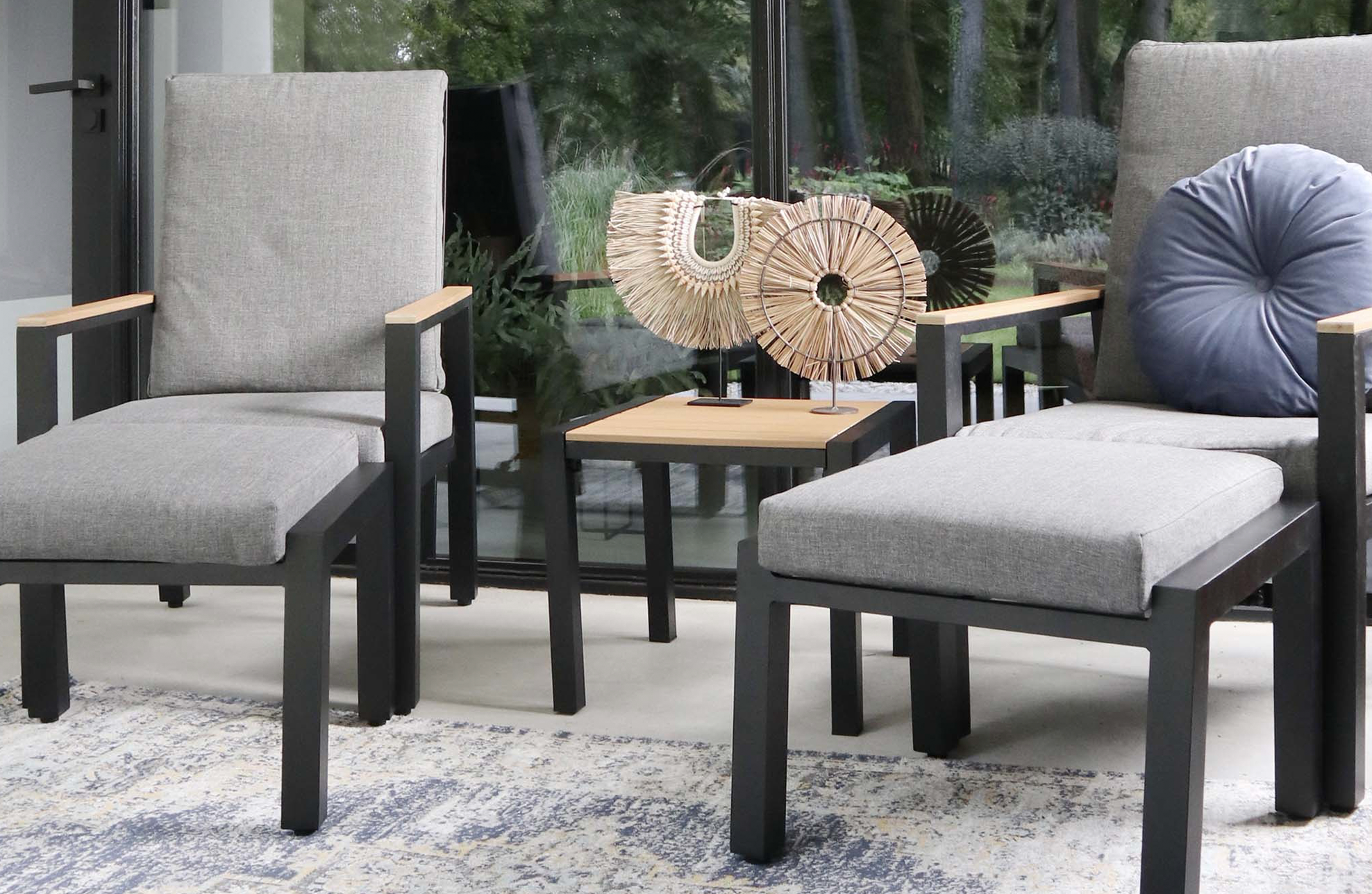 Warum alleine genießen, wenn man zu zweit relaxen kann? Die Duo-Lounge Coda vereint zwei gemütlich gepolsterte Aluminium-Sessel mit einem passenden Hocker und einem kleinen Tisch für Getränke, Snacks oder das Lieblingsbuch. Die stilvollen Holzdetails sorgen für eine warme, hochwertige Optik. Perfekt für gesellige Sommerabende!