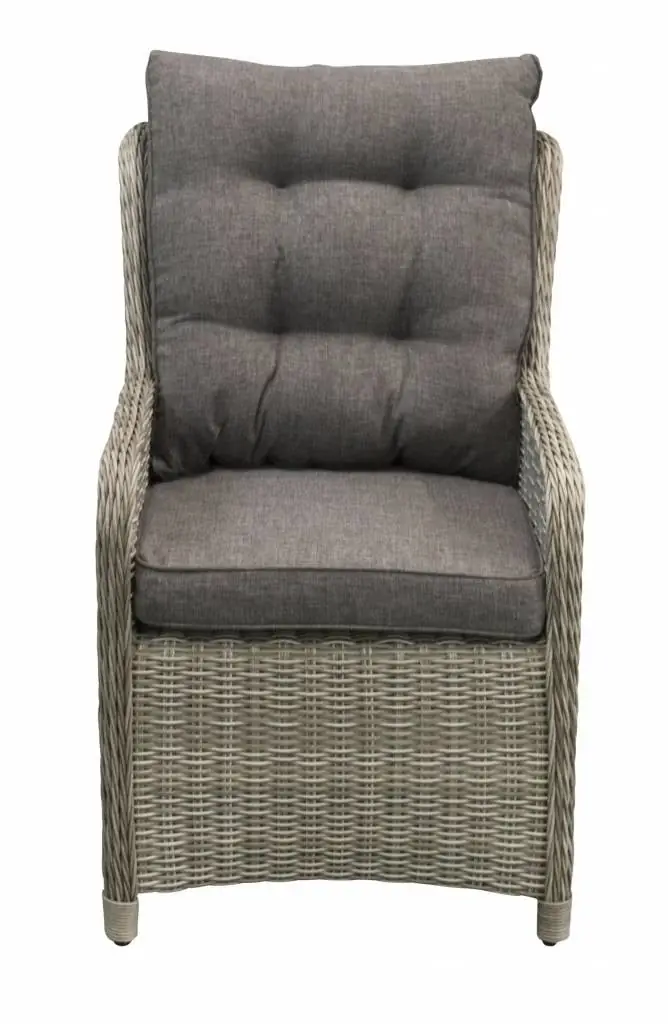Dieser bequeme, verstellbare Esszimmerstuhl ist aus Korbgeflecht auf einem Aluminiumrahmen gefertigt. Der Stuhl ist mit einem dicken Sitz- und Rückenkissen ausgestattet, dessen Bezug abnehmbar und somit waschbar ist. Die Materialien sind langlebig und sehr pflegeleicht und machen diese Stühle geeignet für den ganzjährigen Einsatz im Freien. Wir empfehlen jedoch, sie mit einer Schutzhülle zu versehen, wenn sie für längere Zeit nicht benutzt werden. Zudem ist es zu empfehlen, die Kissen bei Nichtgebrauch im Inneren oder in Kissentaschen aufzubewahren - die Taschen können Sie auch bei uns im Shop erhalten.