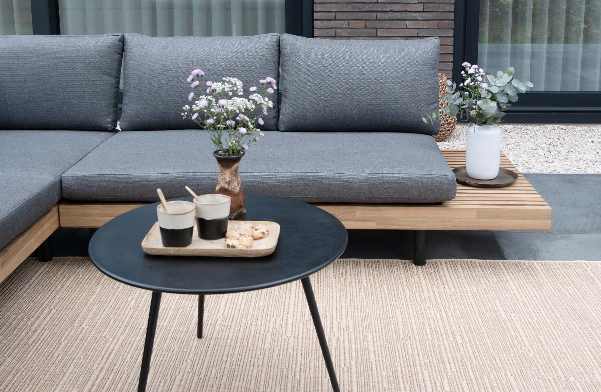 Schaffen Sie einen stilvollen und einladenden Platz im Freien mit dem Loungeset Lissabon. Dieses geräumige Loungeset ist perfekt für entspannte Momente mit Familie und Freunden. Das Gestell in luxuriöser Teakholzoptik in der dunklen Farbe Anthrazit strahlt Eleganz aus und ist eine schöne Ergänzung für jeden Garten oder jede Terrasse. Das Set besteht aus drei Teilen - diese Elemente sind mit Klettbändern fest miteinander verbunden, so dass das Set immer an seinem Platz bleibt. Das Design zeichnet sich durch die abgerundeten Enden der Sofateile aus, die zum organischen und modernen Charakter der Lounge-Garnitur beitragen.