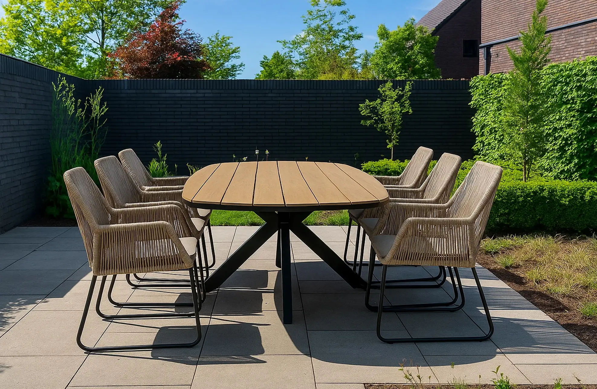 Ein beiges Gartenmöbel-Set bringt Leichtigkeit in den Außenbereich und sorgt für eine warme, einladende Atmosphäre – perfekt für entspannte Stunden im Freien, gesellige Essen oder sommerliche Familienfeste.