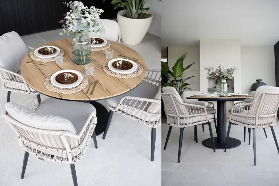 Unsere runden Gartenmöbel-Sets bestehen aus wetterfesten Materialien, die speziell für den Außenbereich entwickelt wurden: