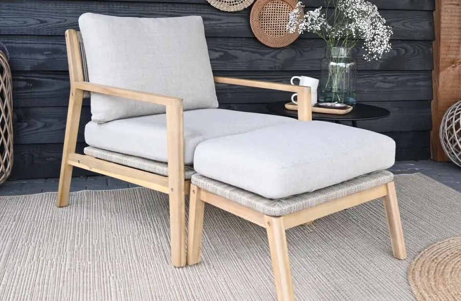- Mit einem Gartensessel mit Hocker für extra Komfort