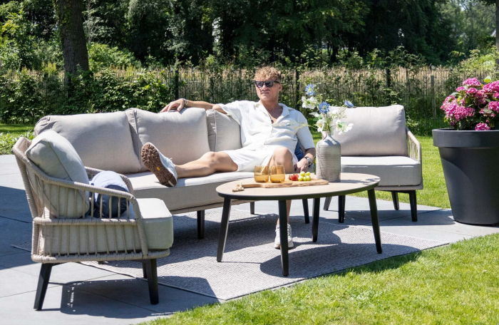 | Eigenschaften | Pulverbeschichteter Aluminiumrahmen, rostfrei, schnelltrocknendes Rope, wartungsfrei, 15 cm dicke Loungekissen, skandinavisches Design |