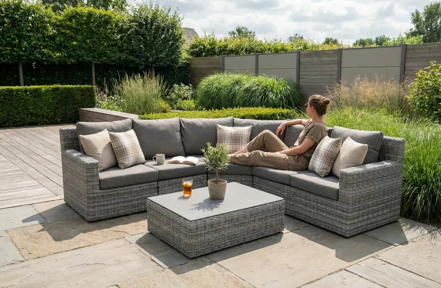 Haben Sie eine große Terrasse? In unserem Sortiment bieten wir verschiedene Ecklounge-Sets an, die Sie selbst zusammenstellen und mit zusätzlichen Elementen erweitern können.
