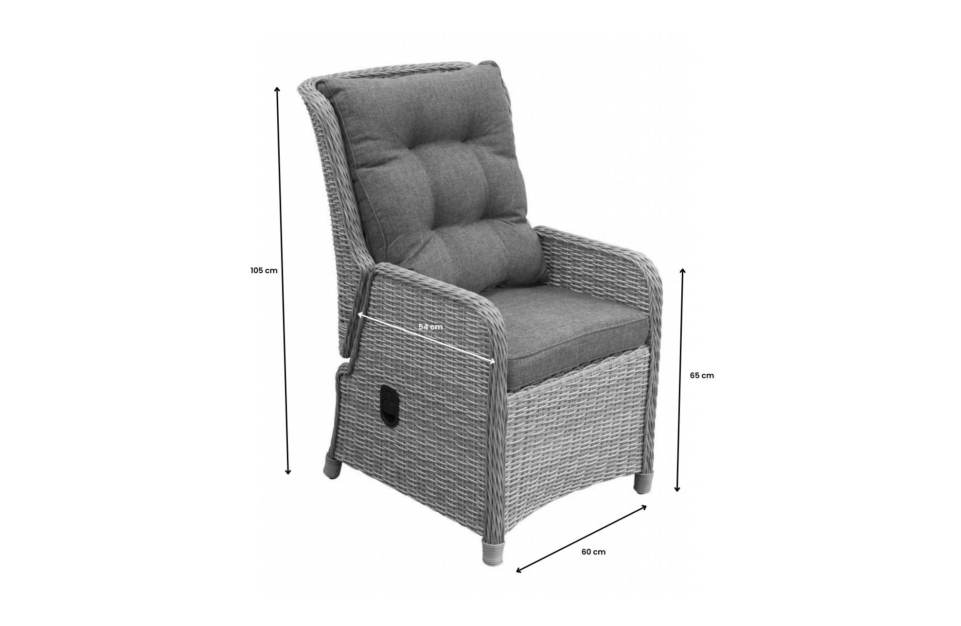 Dieser bequeme verstellbare Dining-Gartenstuhl Dublin ist aus Synthetik-Weidegeflecht auf einem Aluminiumrahmen gefertigt. Der Stuhl verfügt über ein graues Sitz- und Rückenkissen, von dem der Bezug mit einem Reißverschluss abgenommen werden kann und somit waschbar ist. Der luxuriöse, verstellbare Stuhl ist aus langlebigen Materialien gefertigt und daher wartungsfrei - Er eignet sich also hervorraged für den ganzjährigen Einsatz im Freien. Der Stuhl kann mittels einer Gasfeder in jede beliebige Position gebracht werden. Der passende bequeme Hocker ist ebenfalls aus Weidegeflecht auf einem Aluminiumrahmen gefertigt, die Kissenbezüge sind hier ebenfalls waschbar.