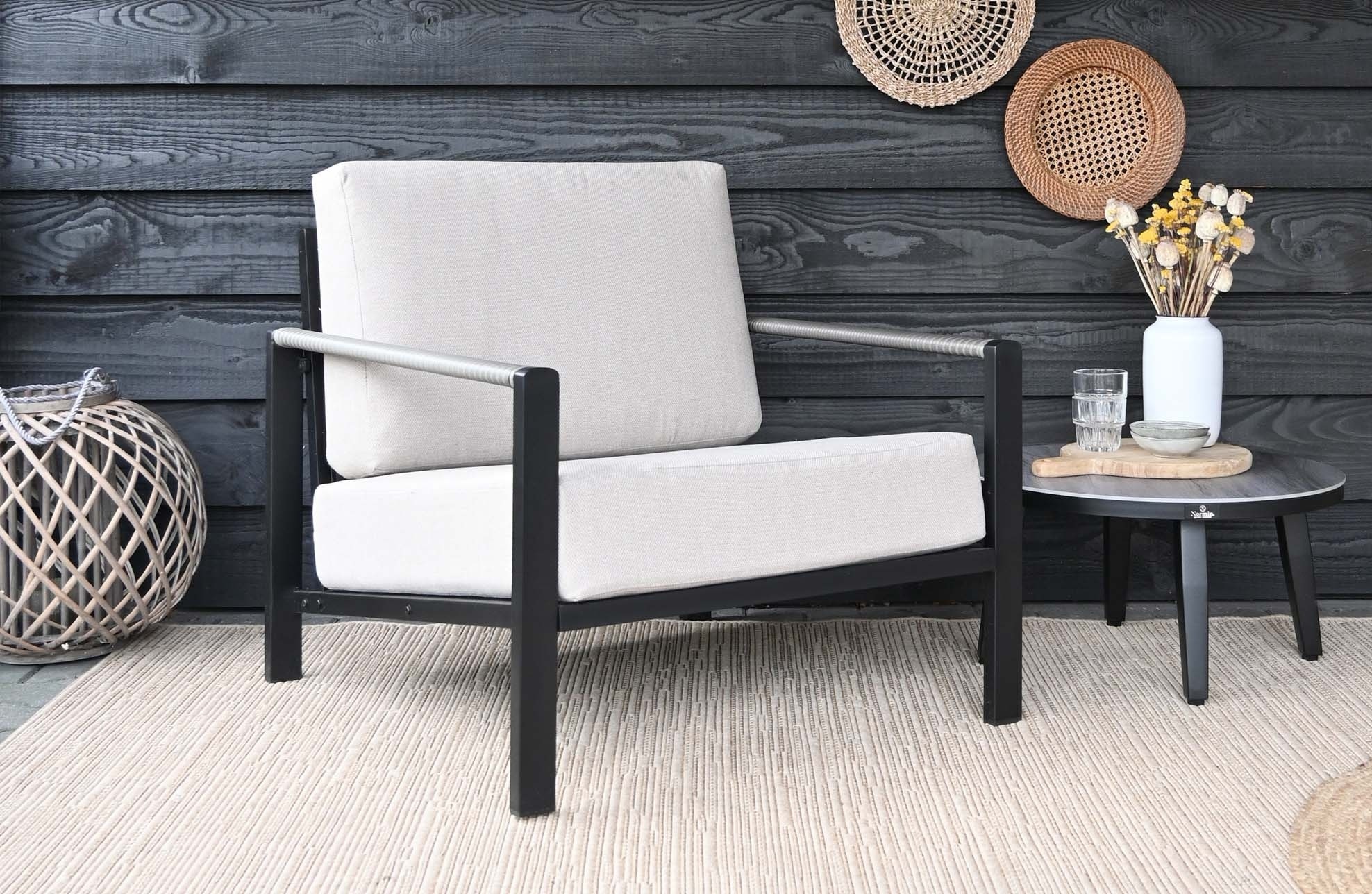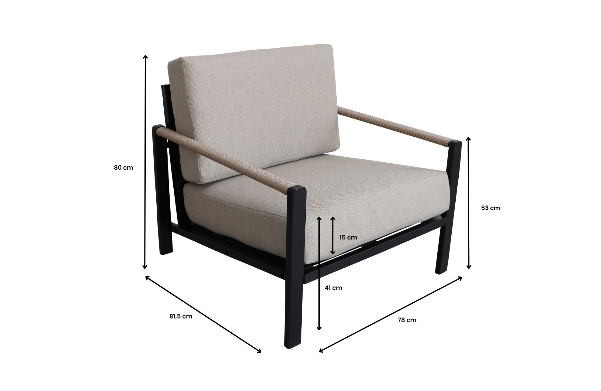 Mit dem modernen Design des Nosso Lounge-Sessels setzen Sie ein echtes Statement in Ihrem Garten! Der Sessel besteht aus einem Mix aus langlebigen Materialien. Die gesamte Nosso-Serie ist dank der dicken Kissen mit hochdichter Schaumstoffpolsterung unglaublich bequem. Die höhere Dichte sorgt für lange Haltbarkeit und mehr Komfort. Die sandfarbenen Kissen sind mit einer wasserabweisenden Beschichtung versehen. Das Gestell besteht aus schwarzem, pulverbeschichtetem Aluminium mit schönen Details aus synthetischem Rattan an den Armlehnen.